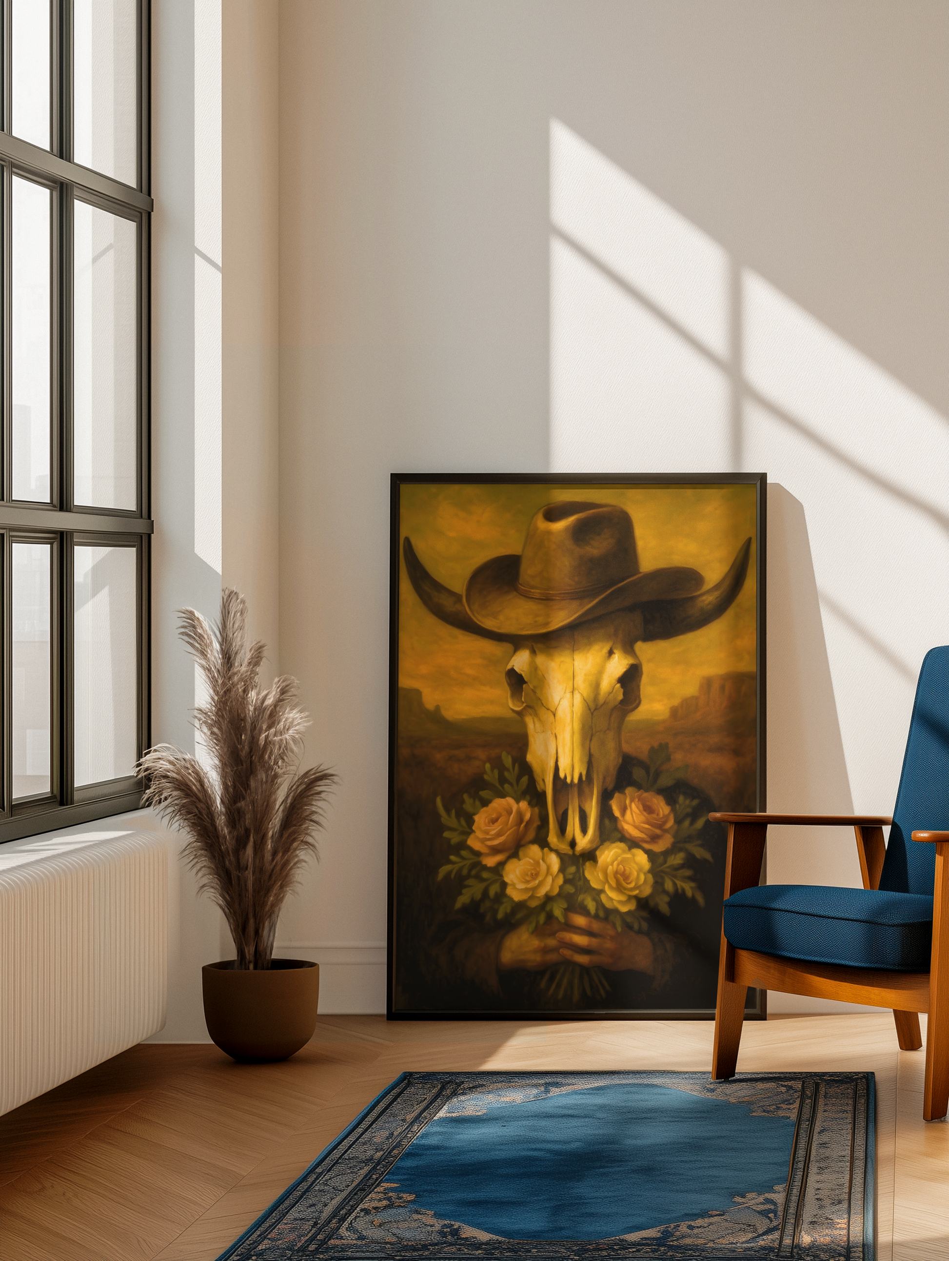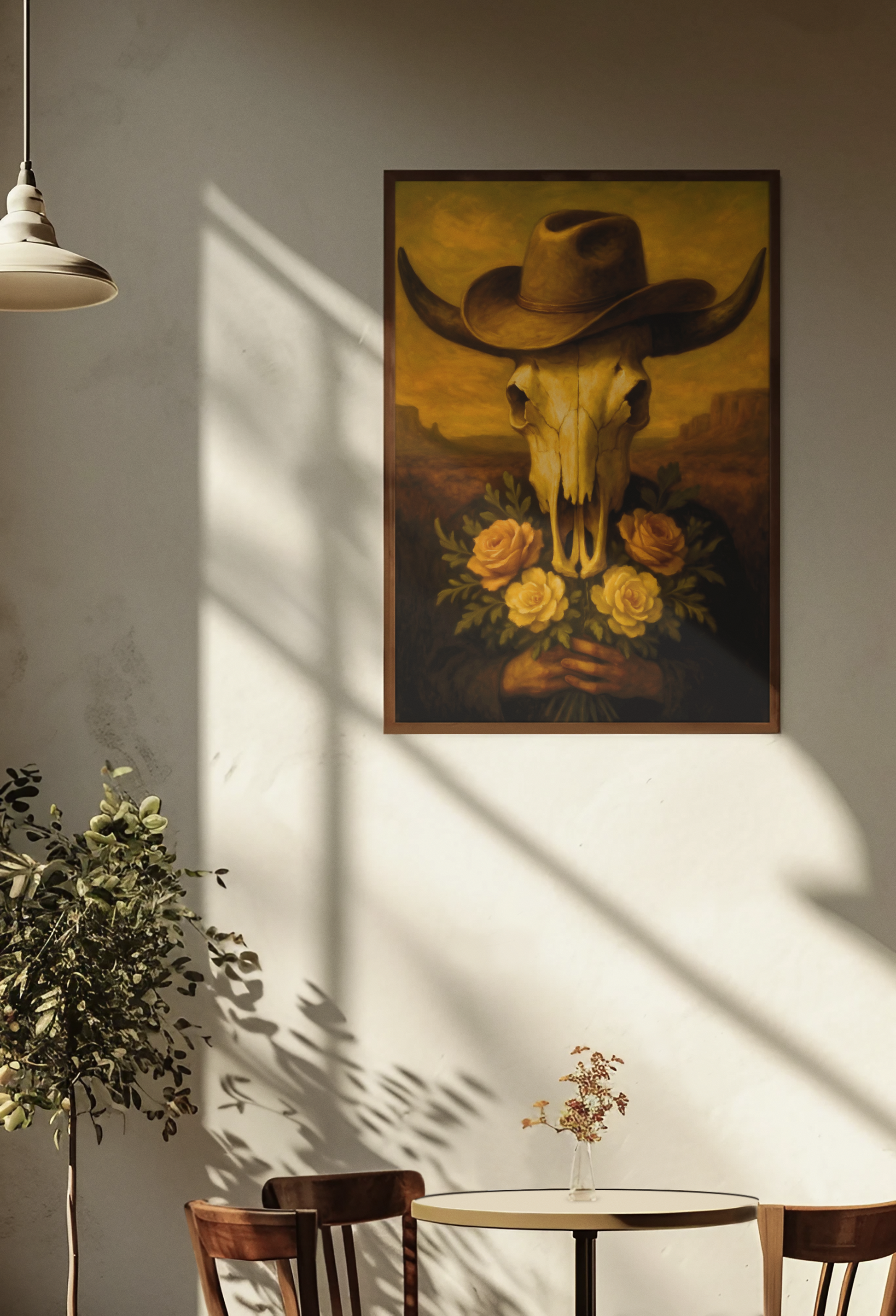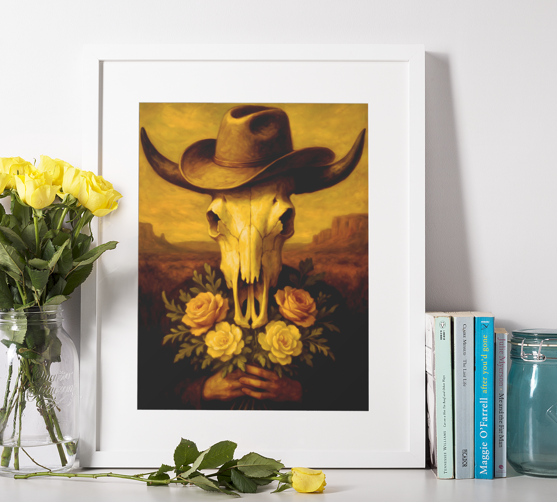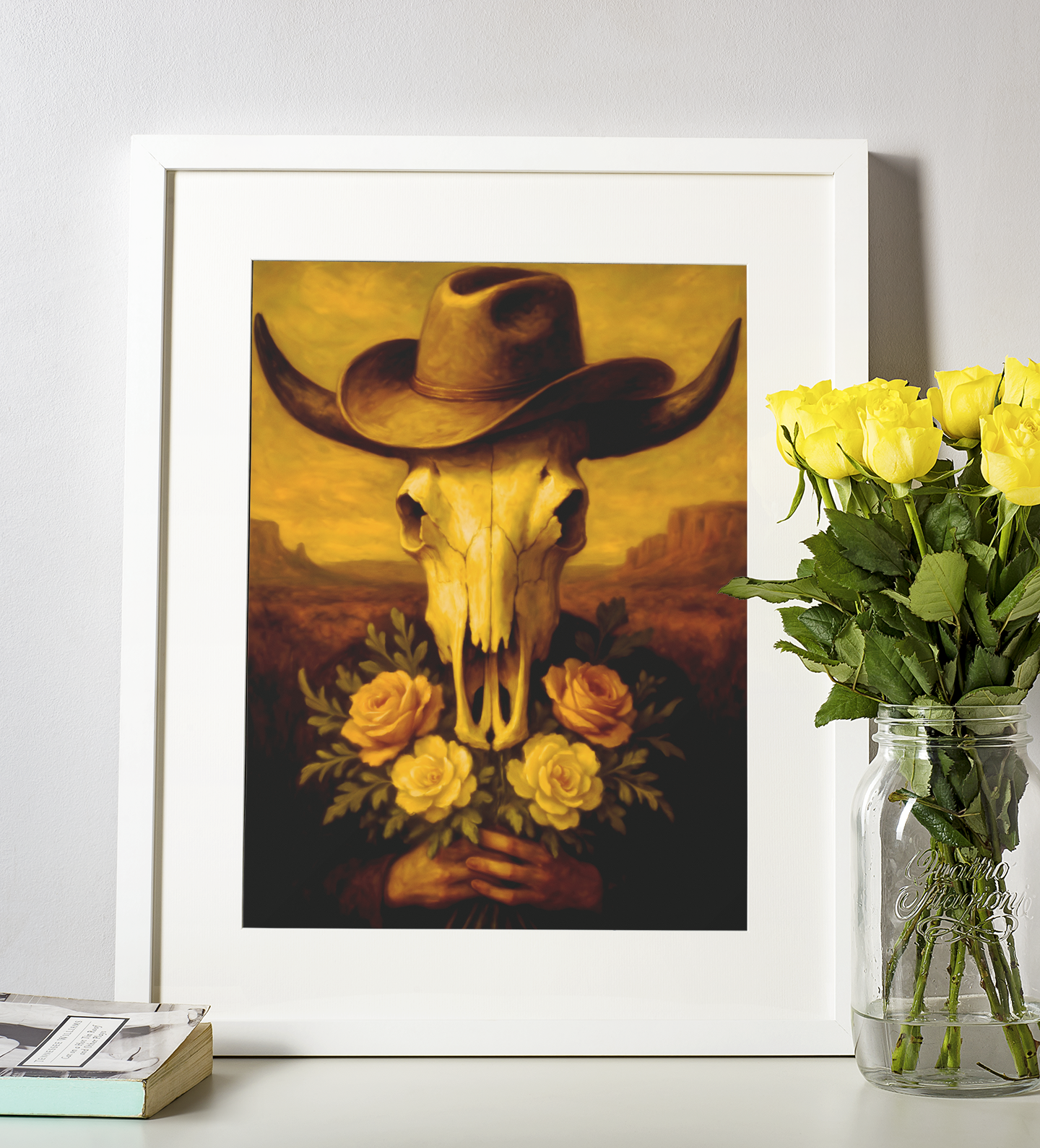 A lone figure of the desert stands beneath a sepia sky — a steer skull wearing a weathered cowboy hat, clutching a bouquet of pale roses. The Courting Hour is a portrait of contrasts: life and death, tenderness and decay, romance and ruin. Painted in the muted glow of a western dusk, it captures the poetry of the frontier’s ghostly heart — where even bones remember how to love.