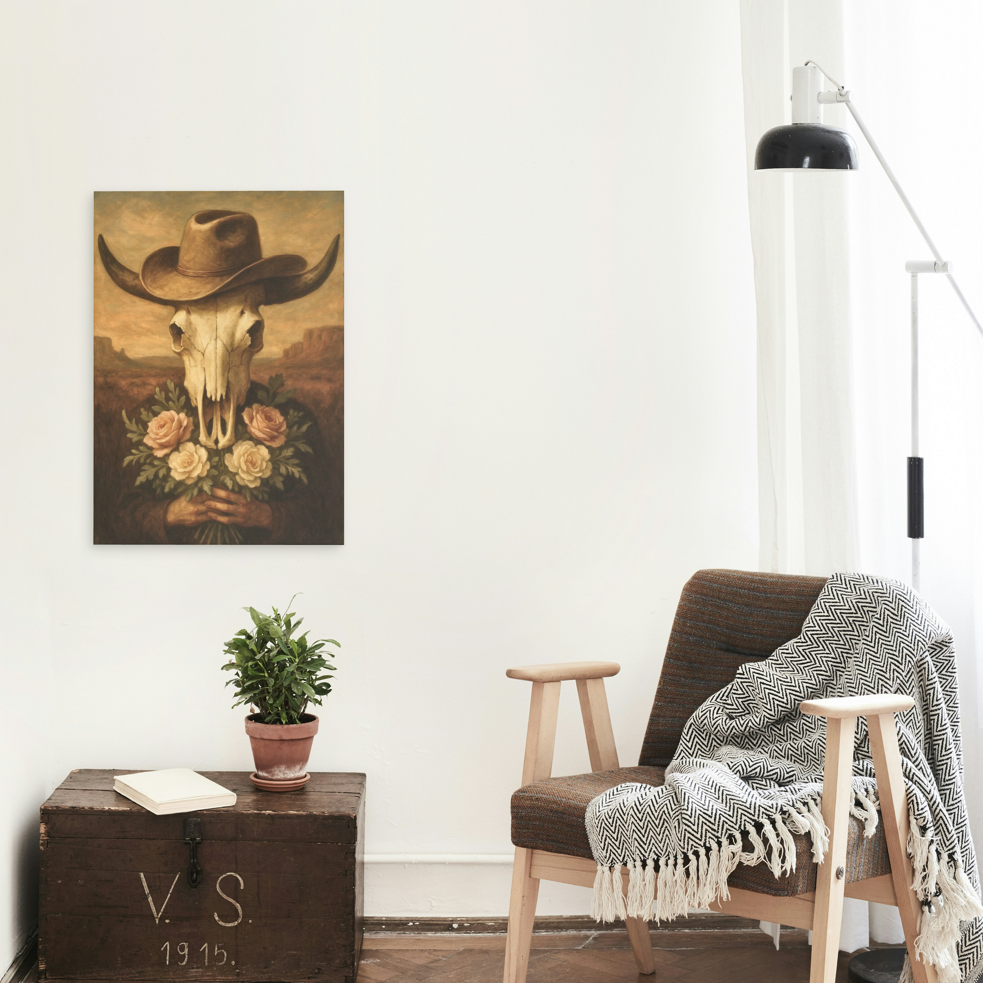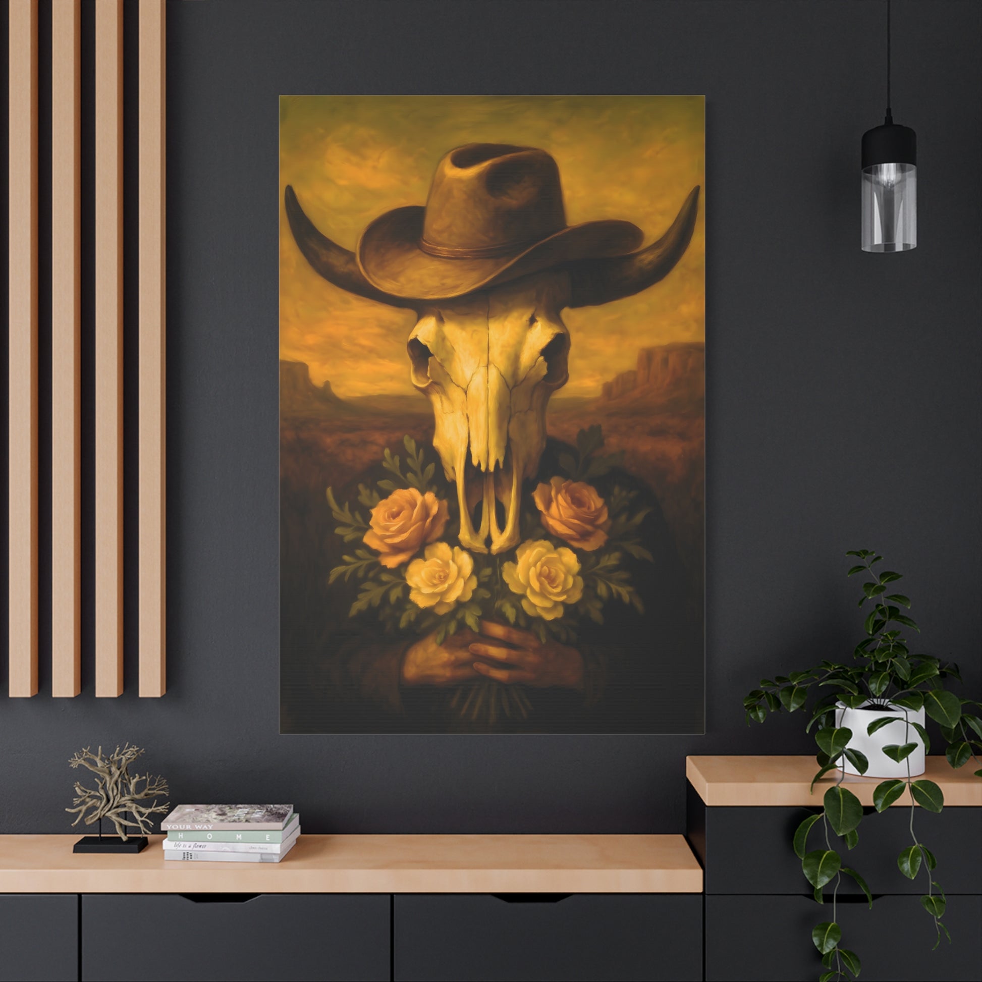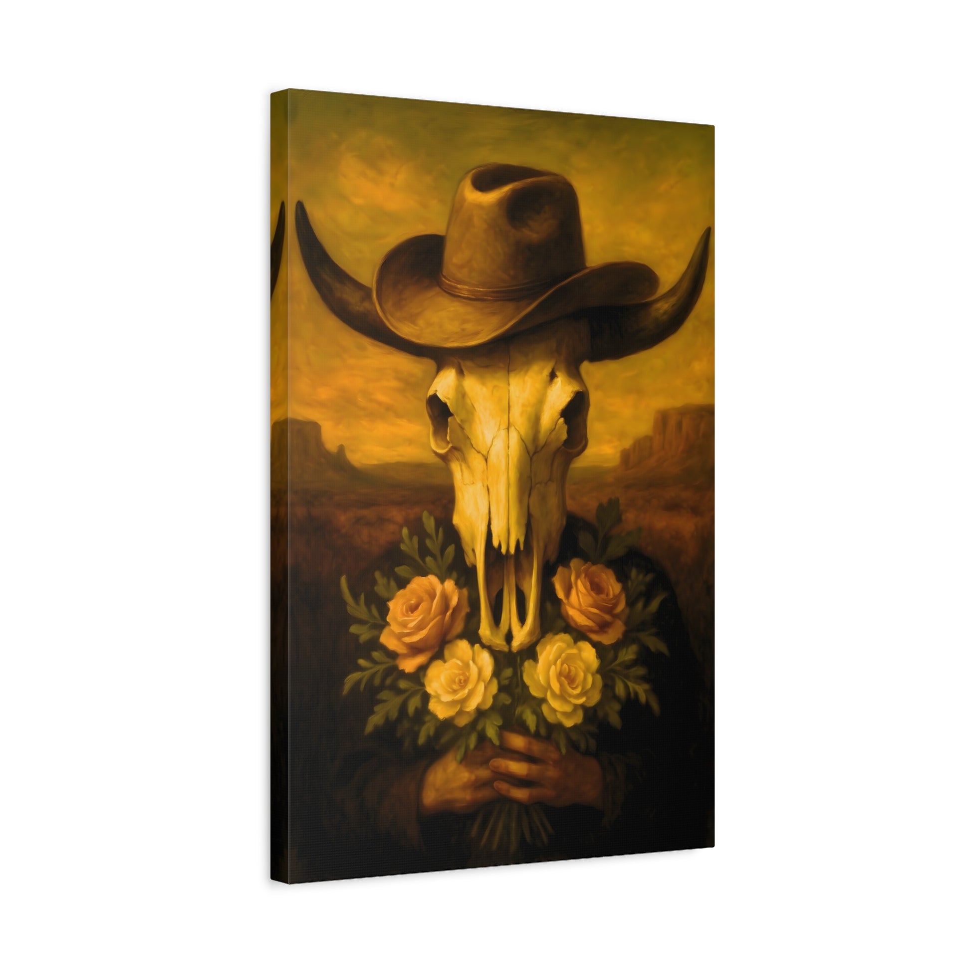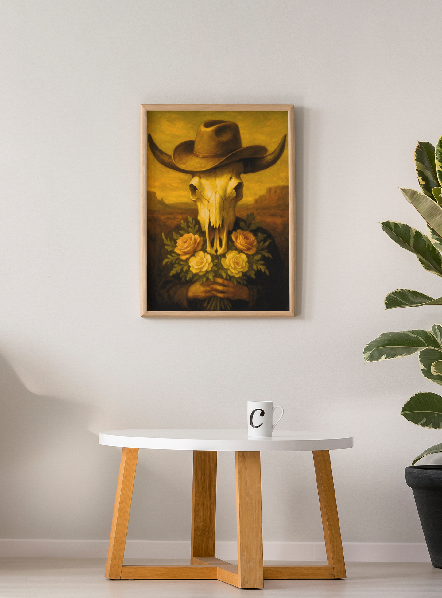 A lone figure of the desert stands beneath a sepia sky — a steer skull wearing a weathered cowboy hat, clutching a bouquet of pale roses. The Courting Hour is a portrait of contrasts: life and death, tenderness and decay, romance and ruin. Painted in the muted glow of a western dusk, it captures the poetry of the frontier’s ghostly heart — where even bones remember how to love.