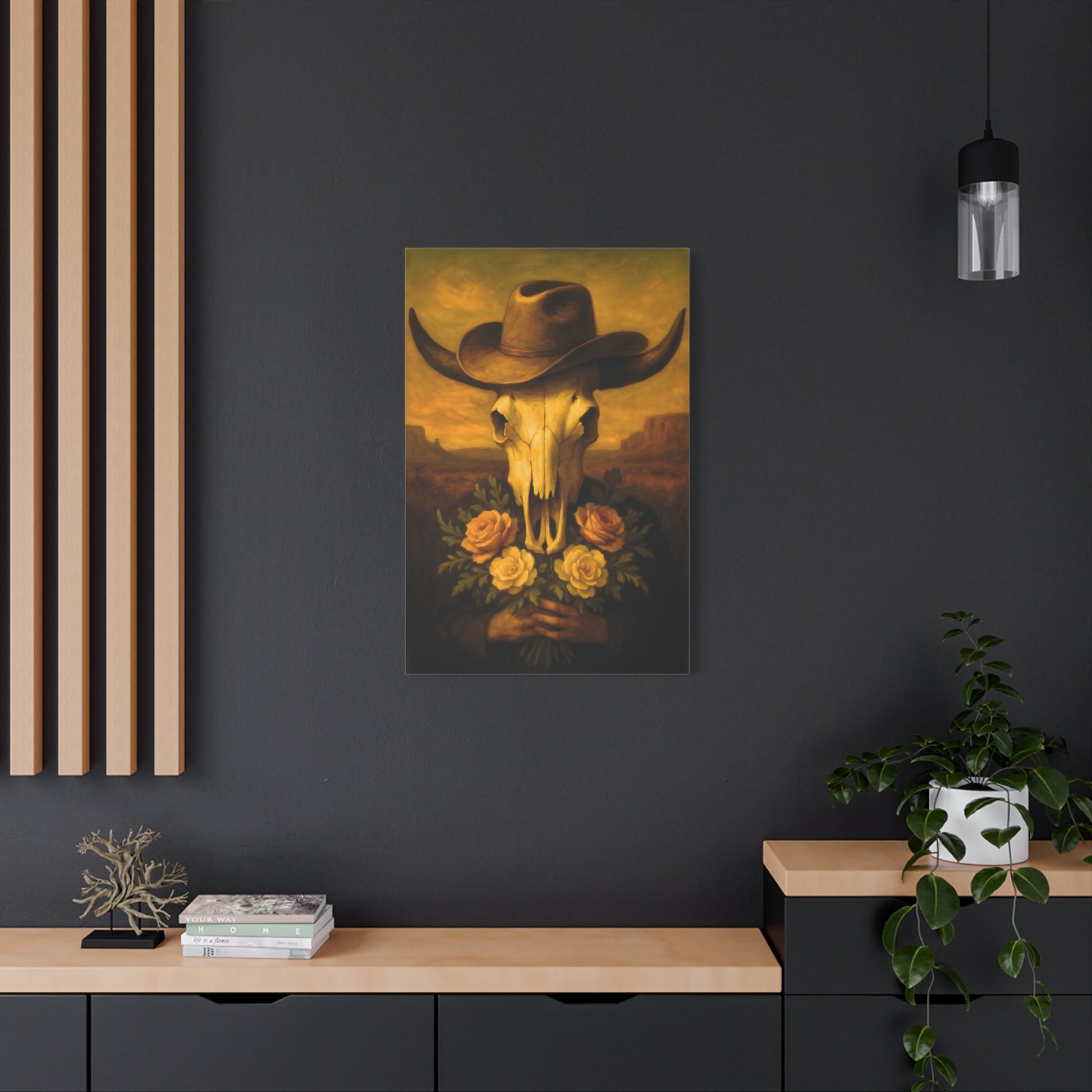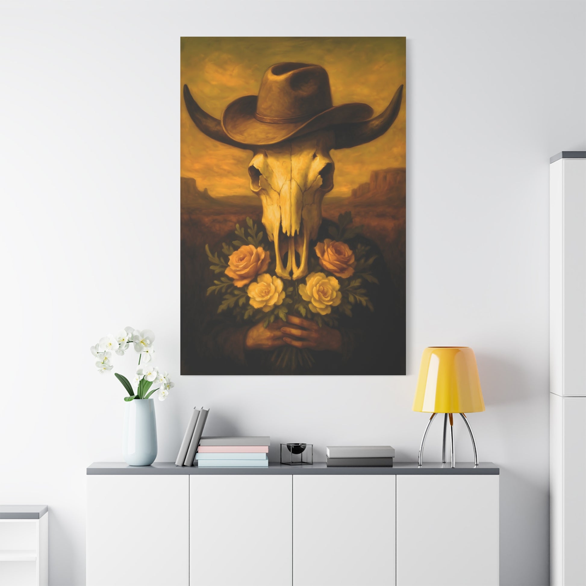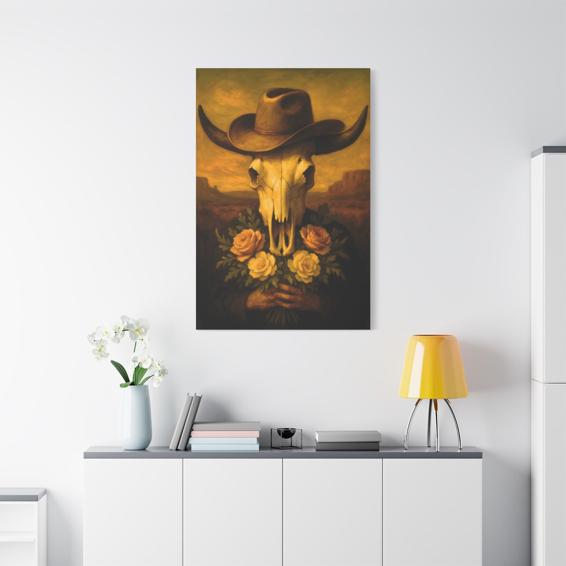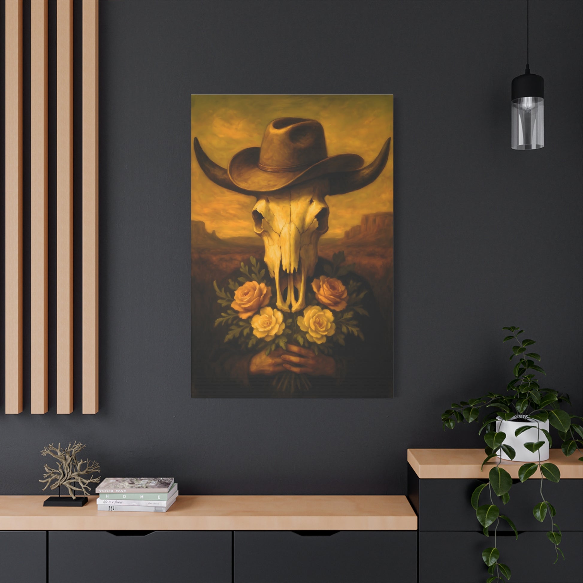A lone figure of the desert stands beneath a sepia sky — a steer skull wearing a weathered cowboy hat, clutching a bouquet of pale roses. The Courting Hour is a portrait of contrasts: life and death, tenderness and decay, romance and ruin. Painted in the muted glow of a western dusk, it captures the poetry of the frontier’s ghostly heart — where even bones remember how to love.