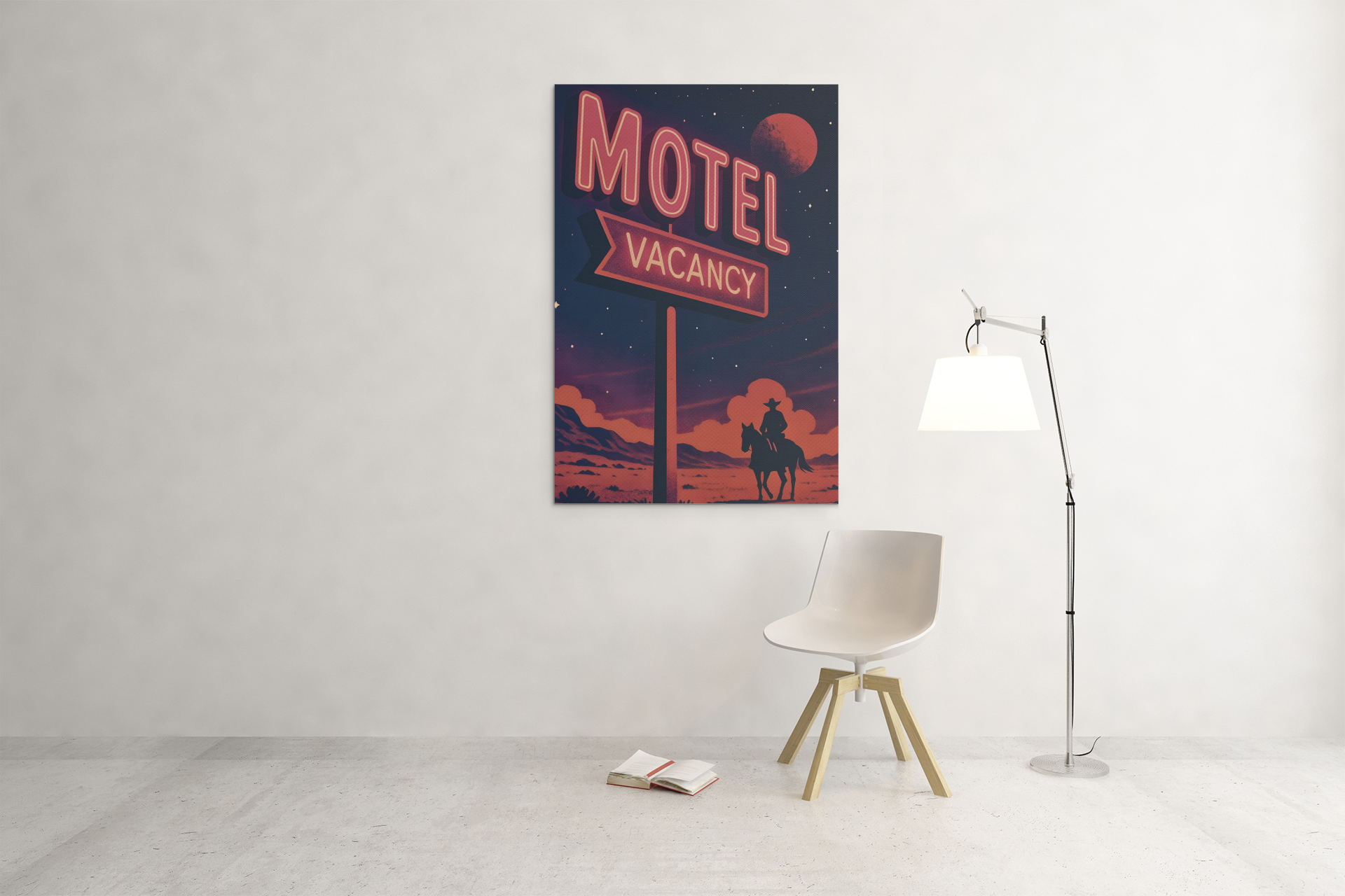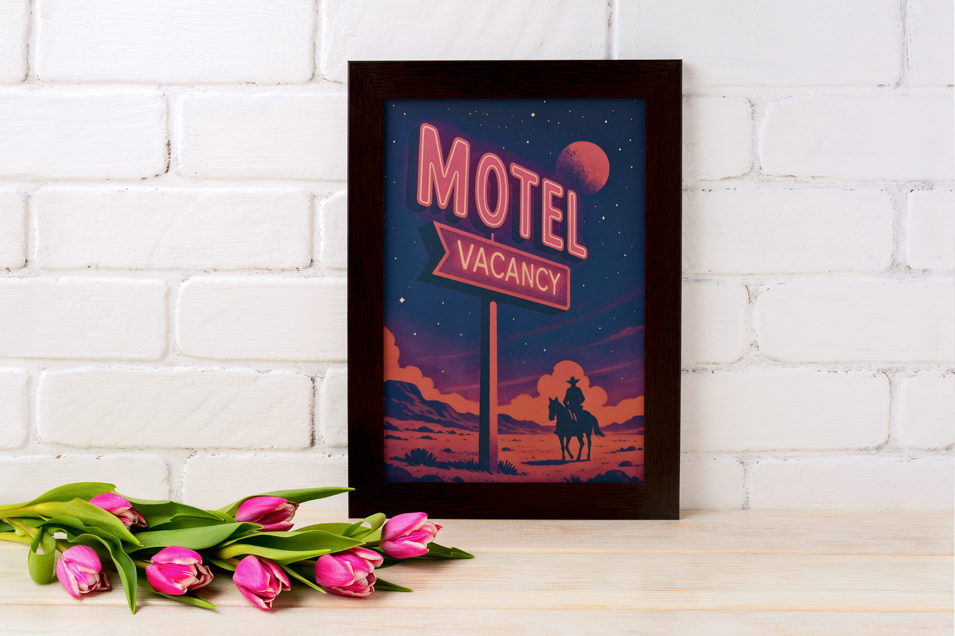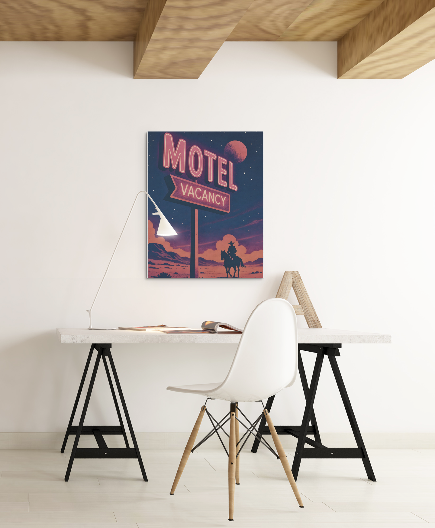 A lone cowboy pauses beneath a glowing neon motel sign, where the desert night hums with silence and the promise of mystery. The surreal landscape, bathed in cosmic pinks and deep indigos, blurs the line between earthly wanderlust and celestial wonder.