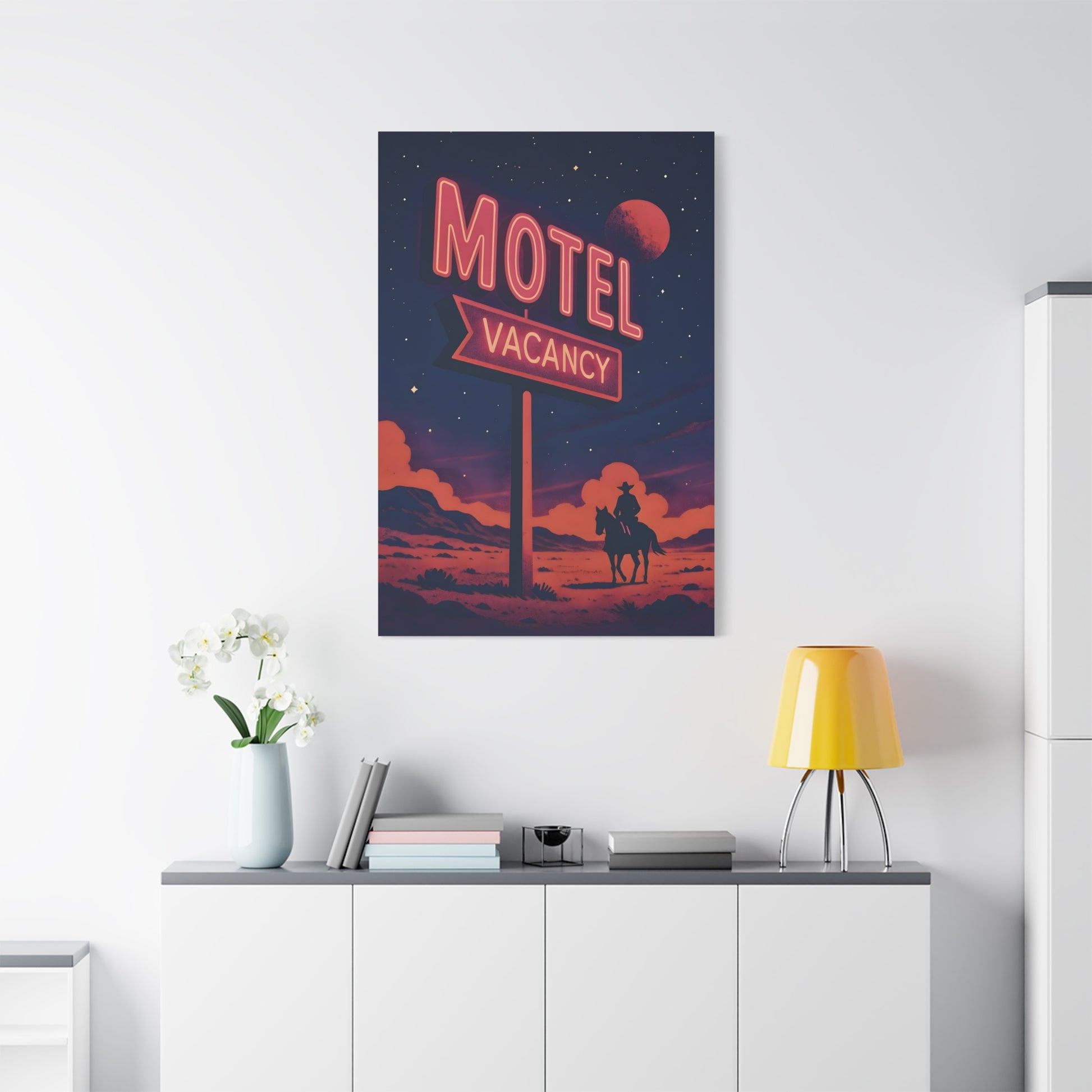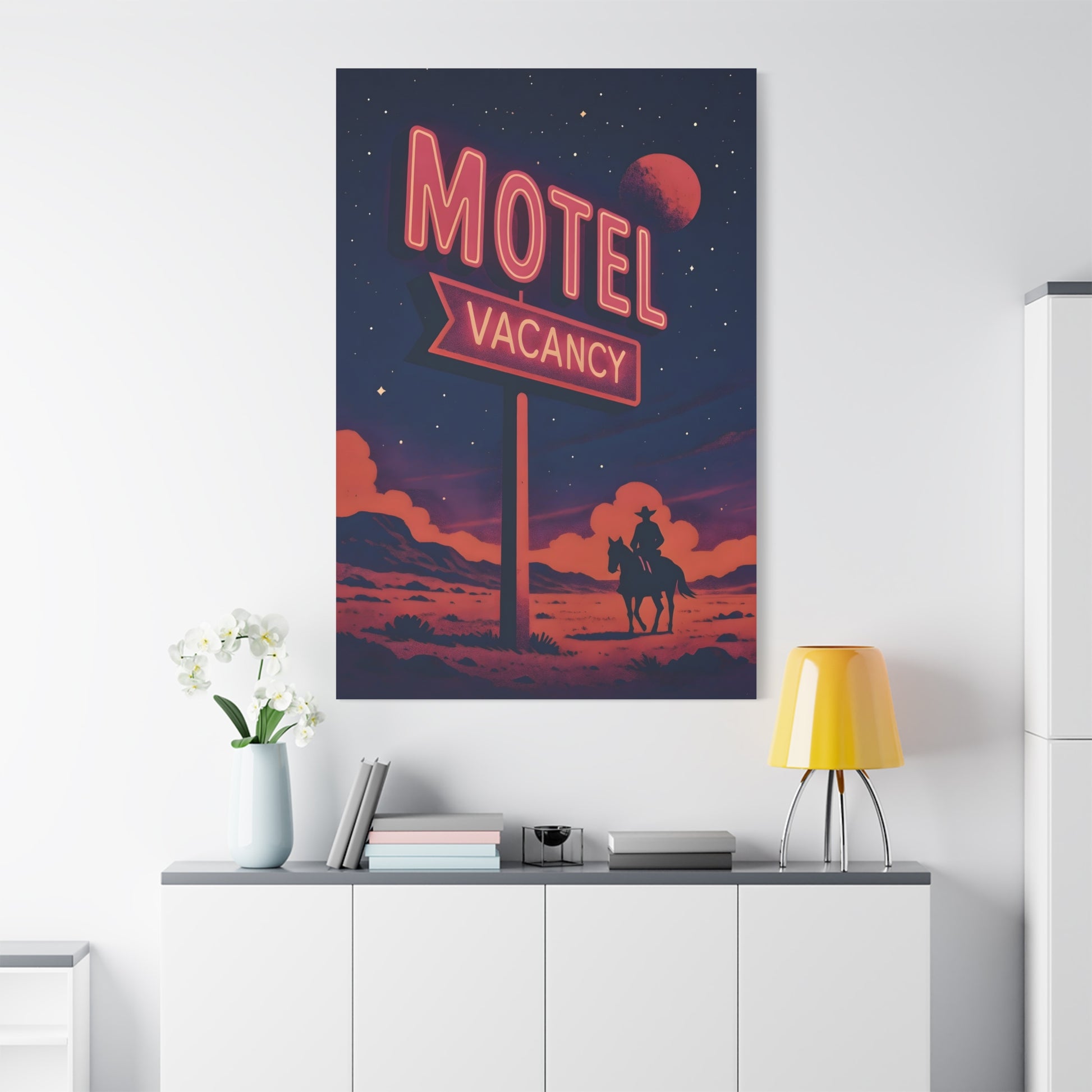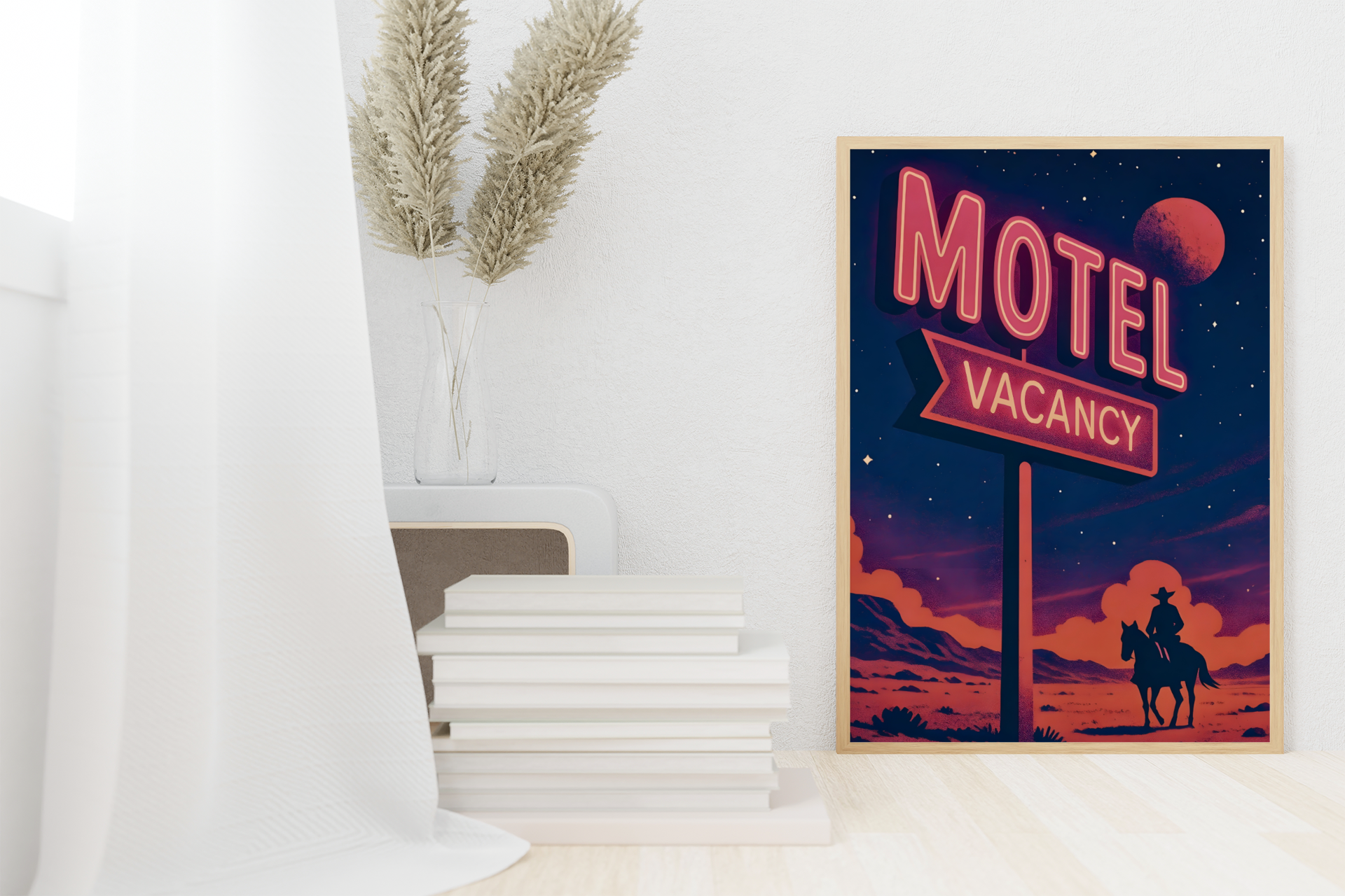 A lone cowboy pauses beneath a glowing neon motel sign, where the desert night hums with silence and the promise of mystery. The surreal landscape, bathed in cosmic pinks and deep indigos, blurs the line between earthly wanderlust and celestial wonder.
