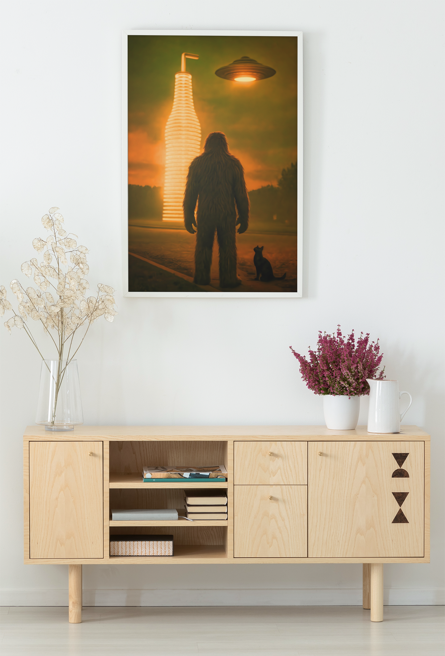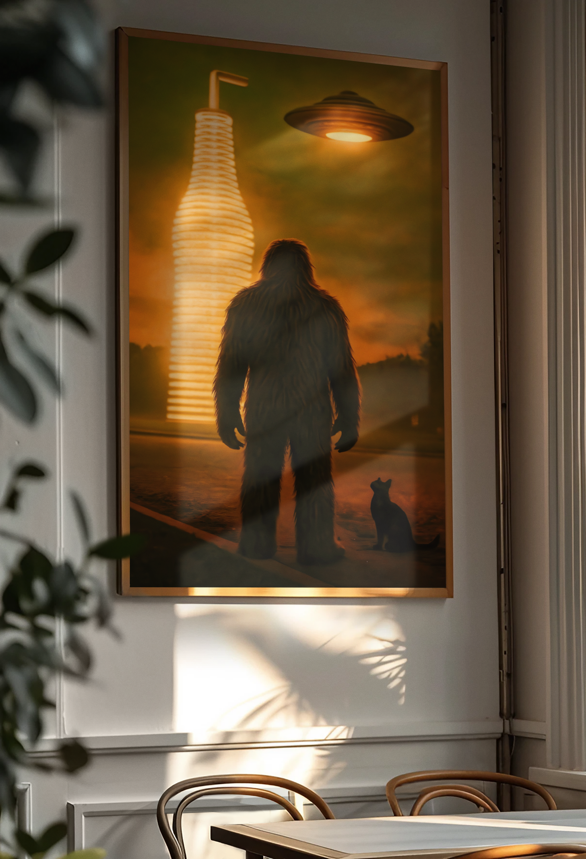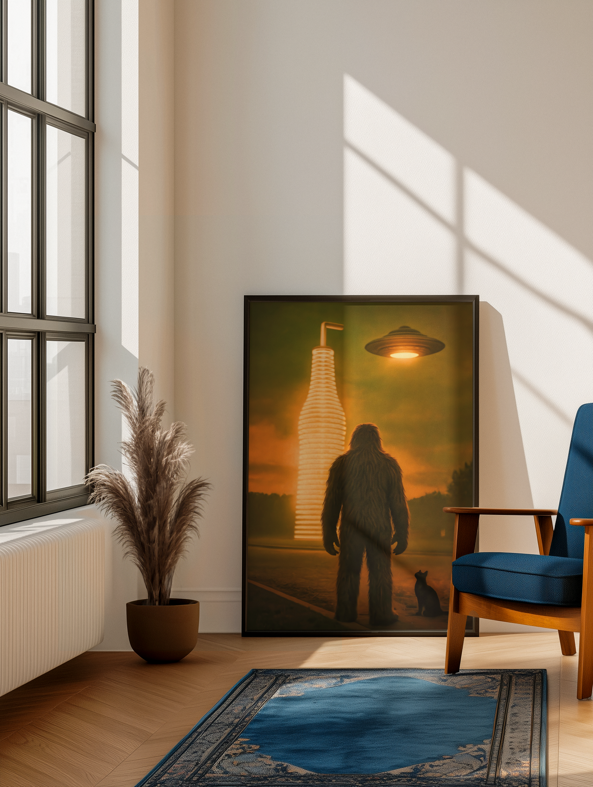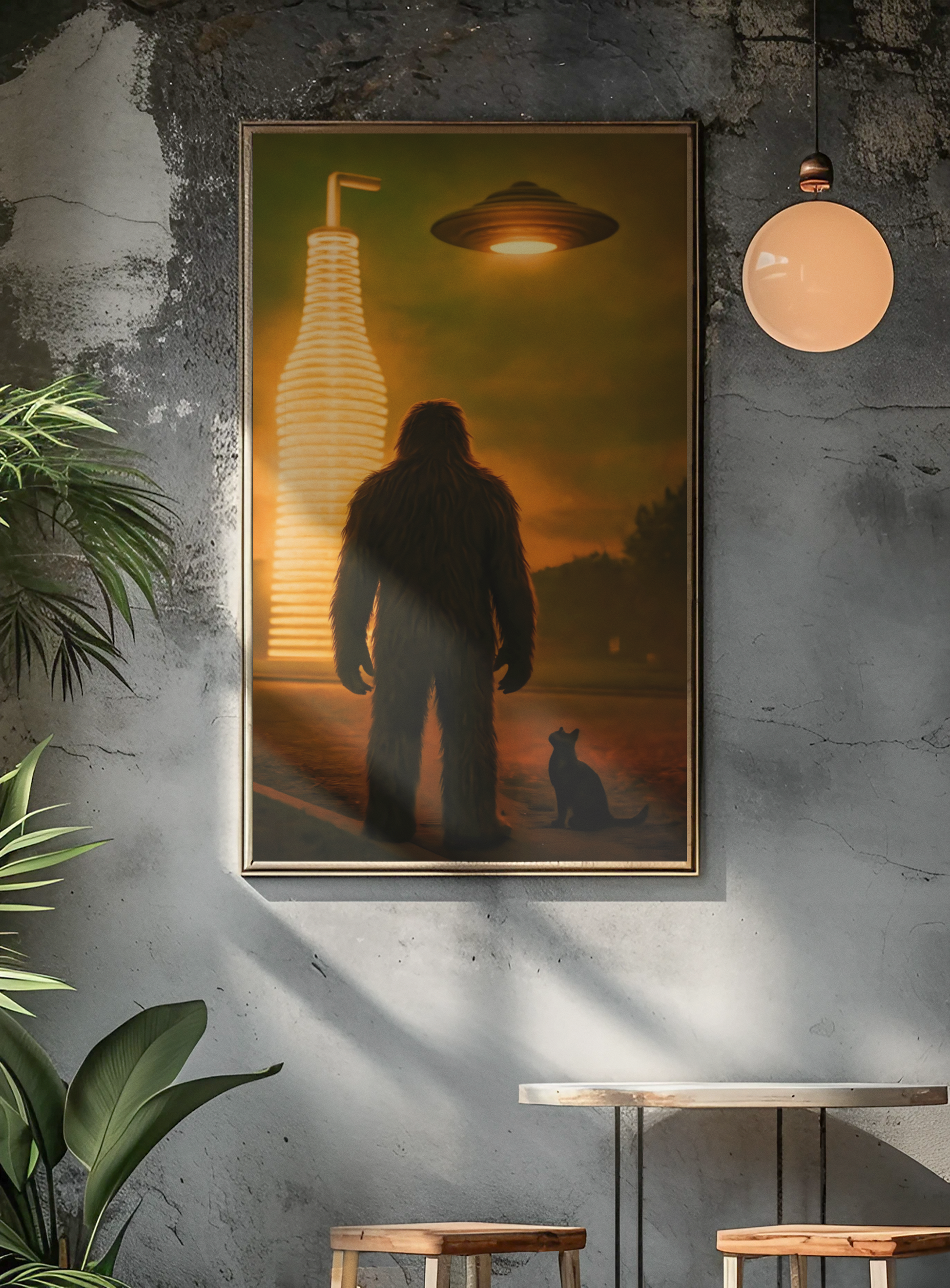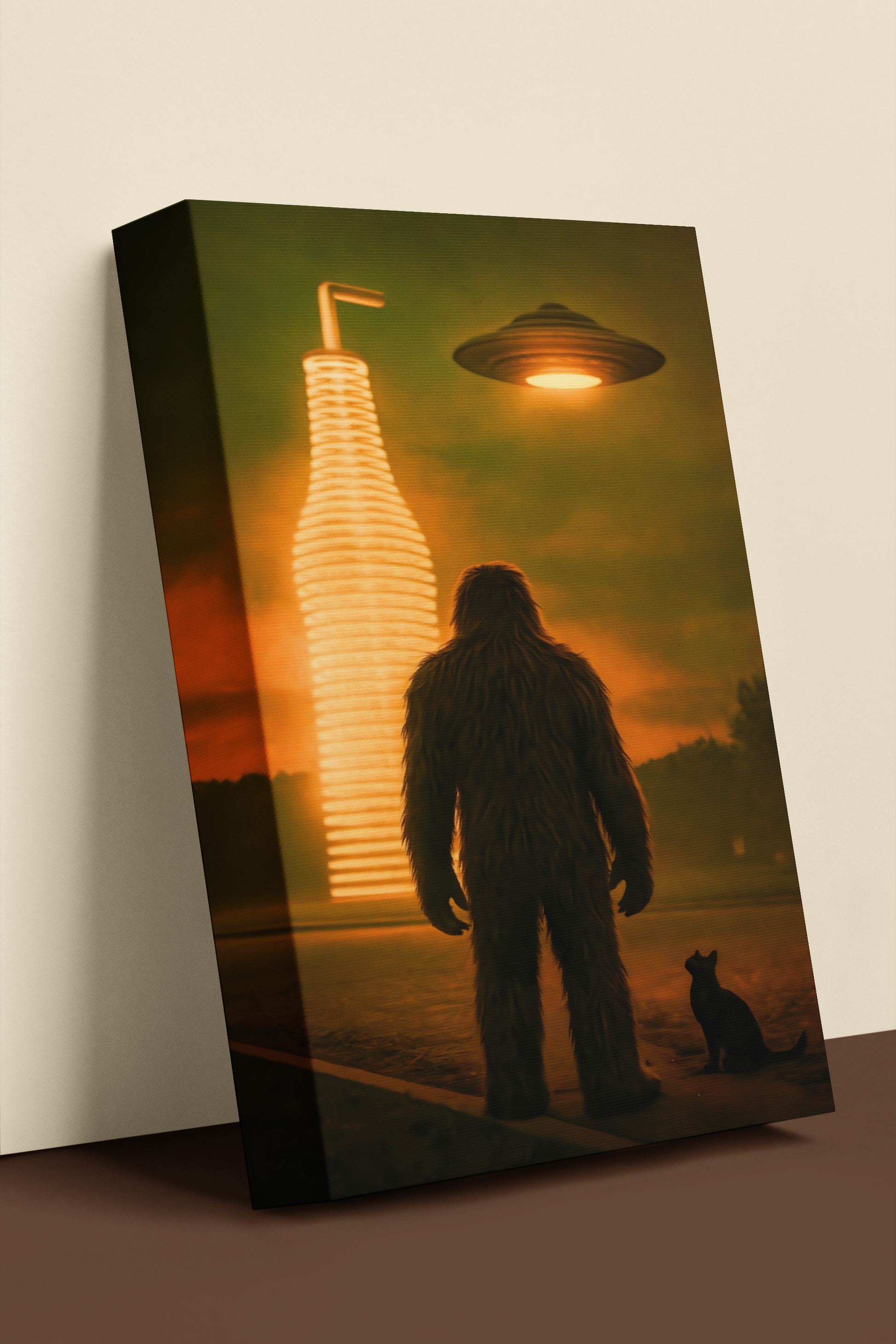 Thorne the Sasquatch and Sebastian the cosmic black cat share a surreal moment under Oklahoma’s neon skies on historic Route 66. Standing before the glowing soda bottle landmark, they witness a hovering UFO that turns the roadside into a stage for the extraordinary. This piece blends Americana nostalgia with paranormal mystery—perfect for fans of cryptids, cosmic folklore, and dreamlike road trip aesthetics.