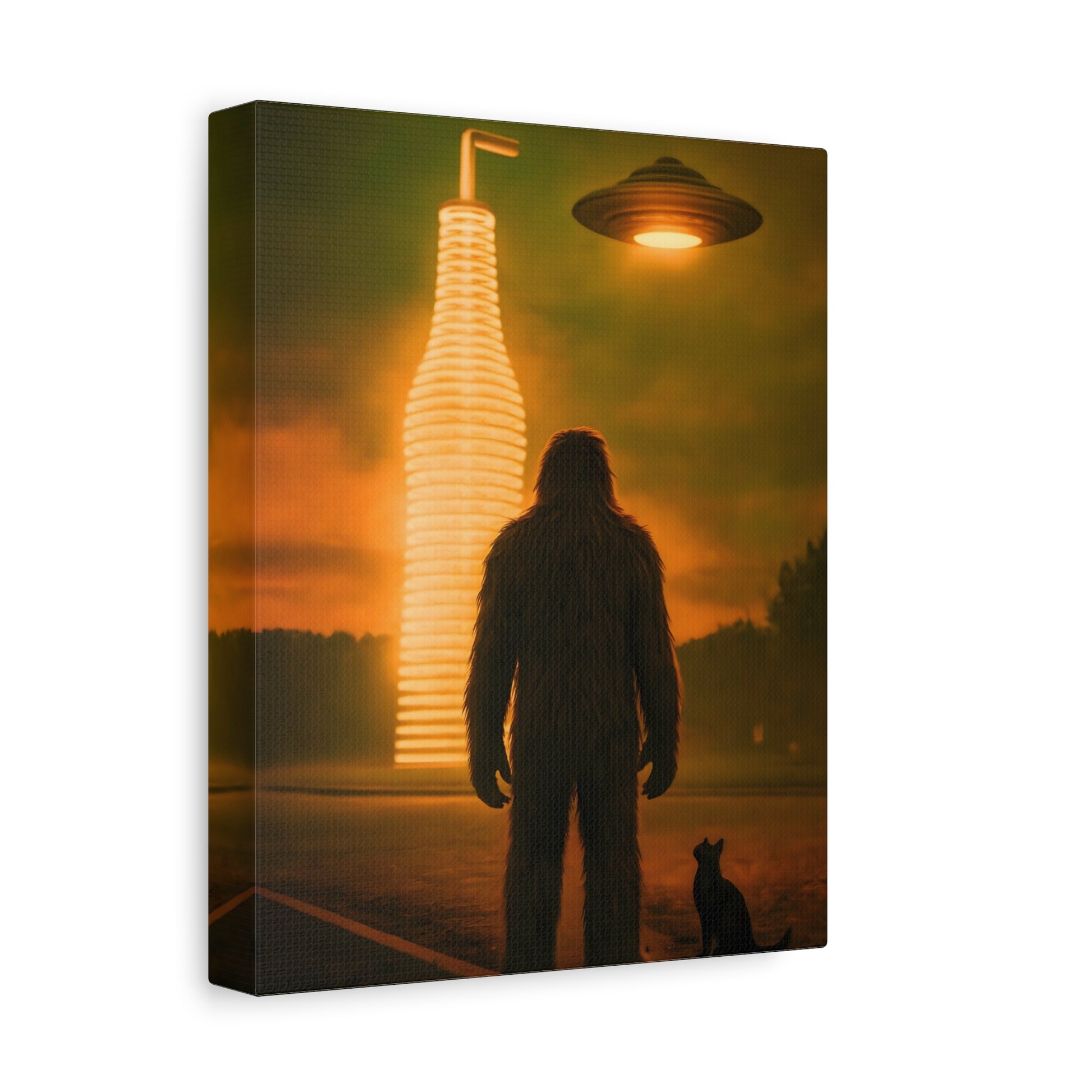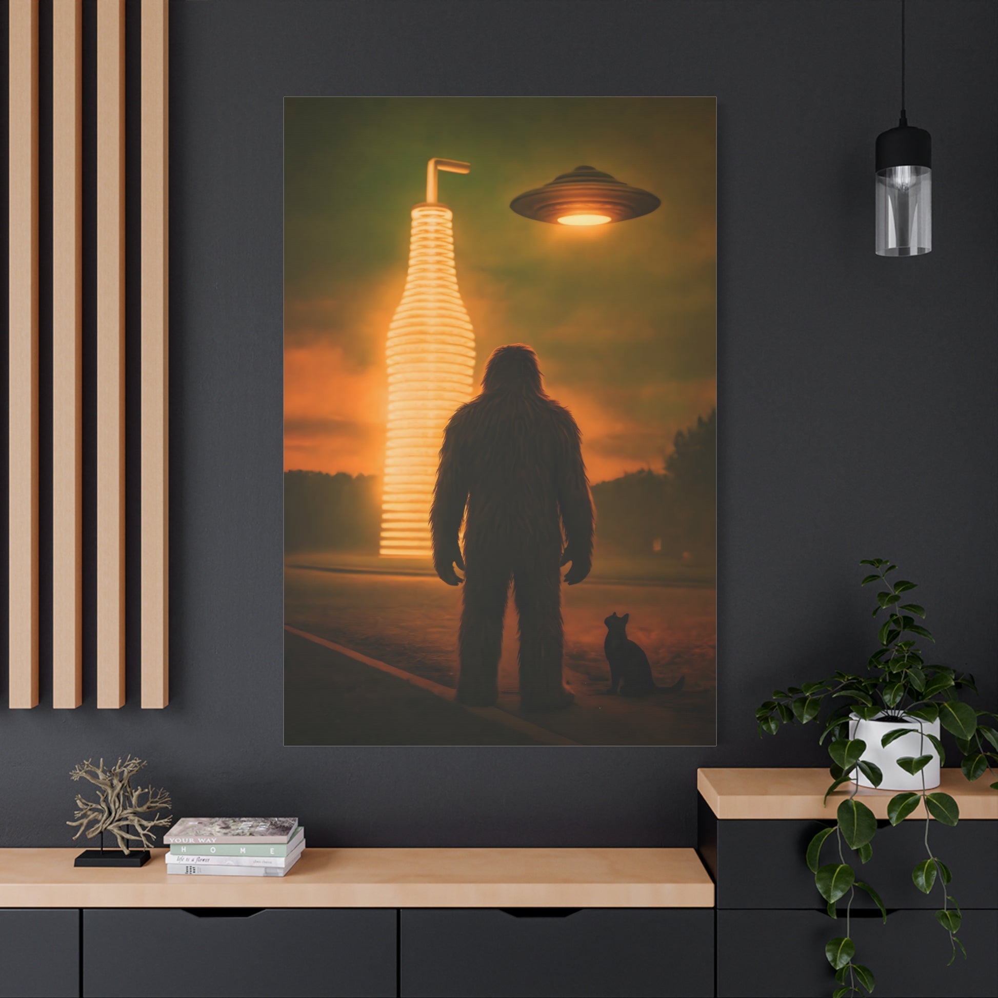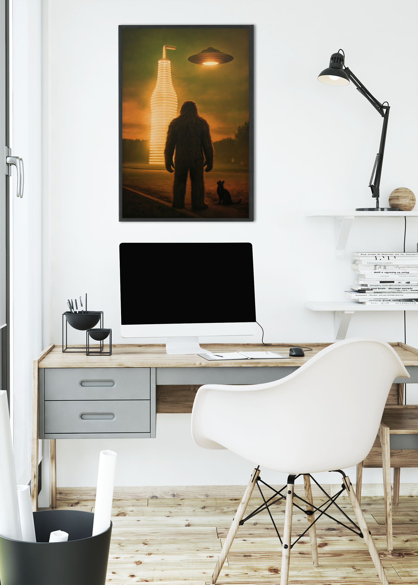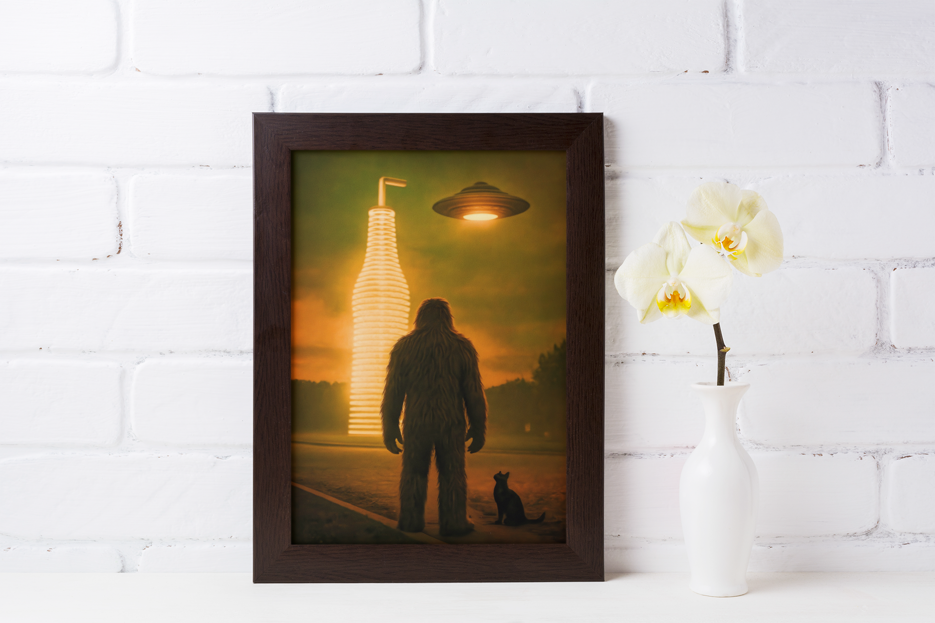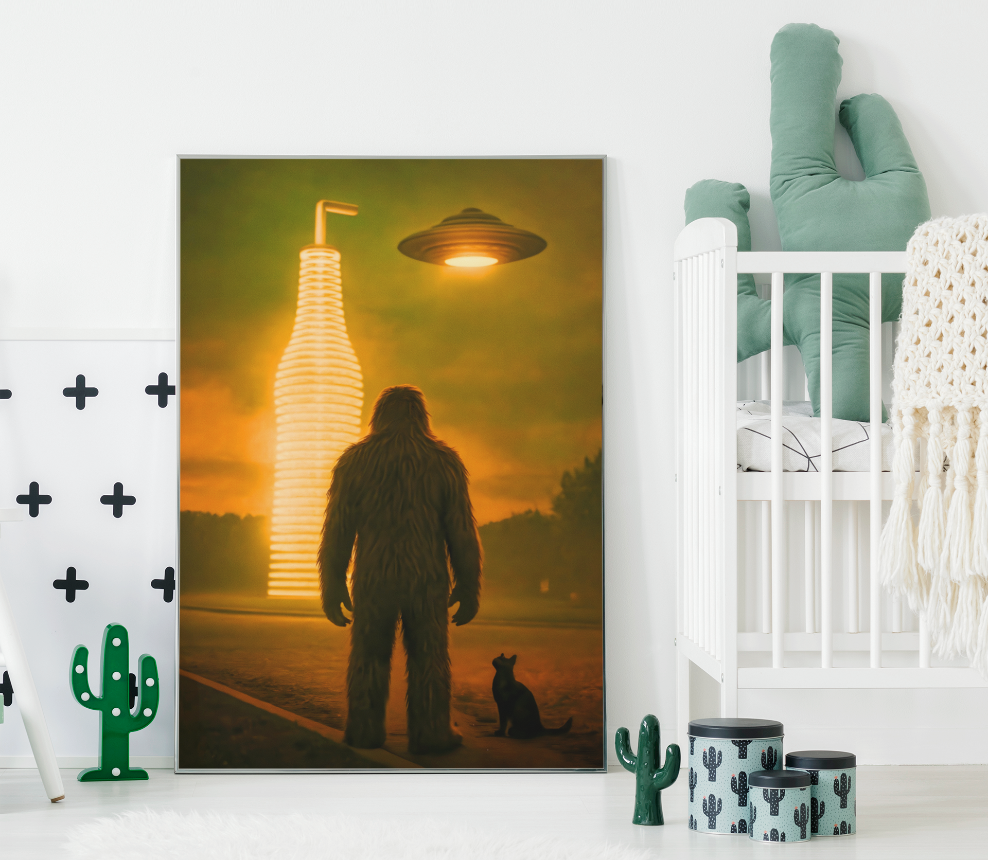 Thorne the Sasquatch and Sebastian the cosmic black cat share a surreal moment under Oklahoma’s neon skies on historic Route 66. Standing before the glowing soda bottle landmark, they witness a hovering UFO that turns the roadside into a stage for the extraordinary. This piece blends Americana nostalgia with paranormal mystery—perfect for fans of cryptids, cosmic folklore, and dreamlike road trip aesthetics.