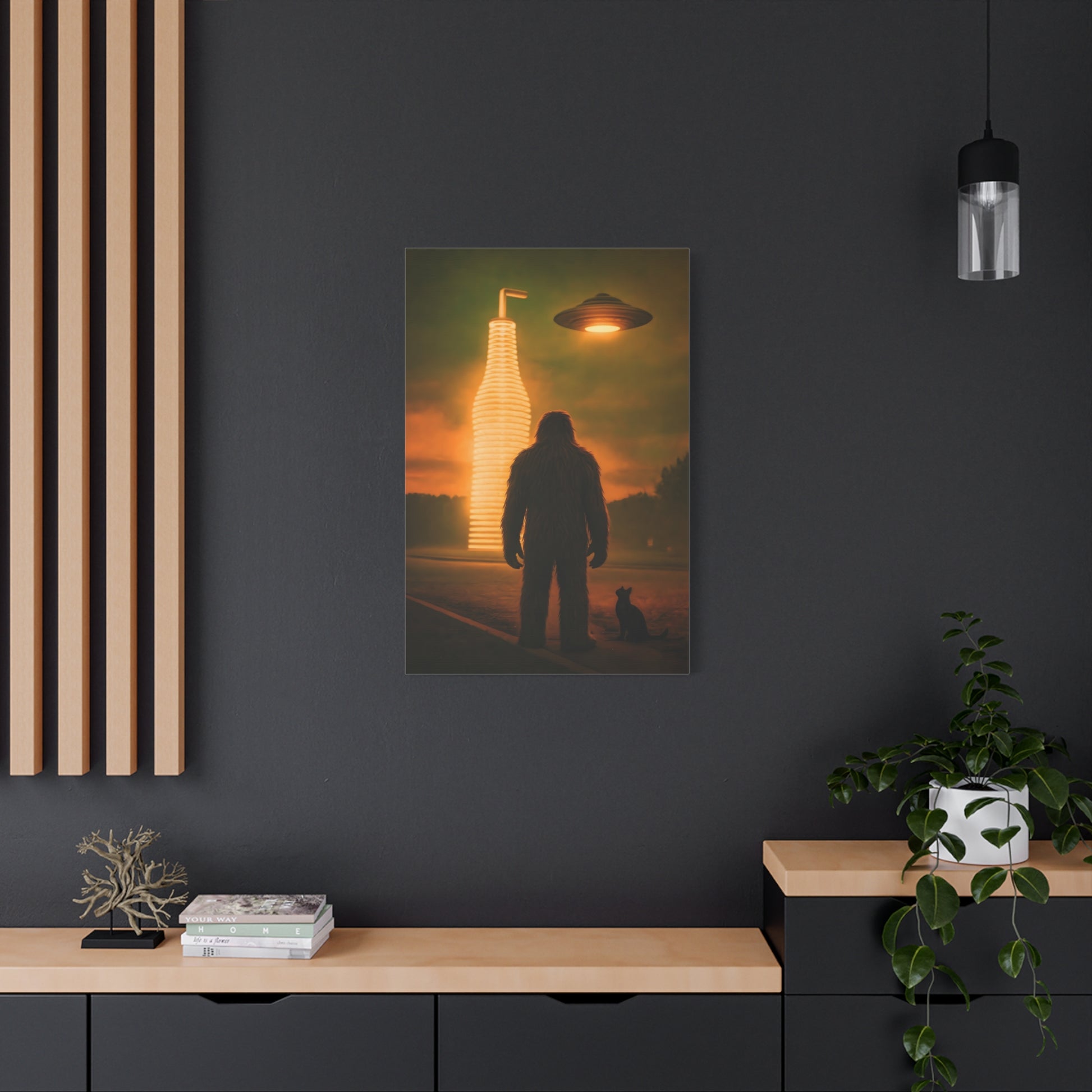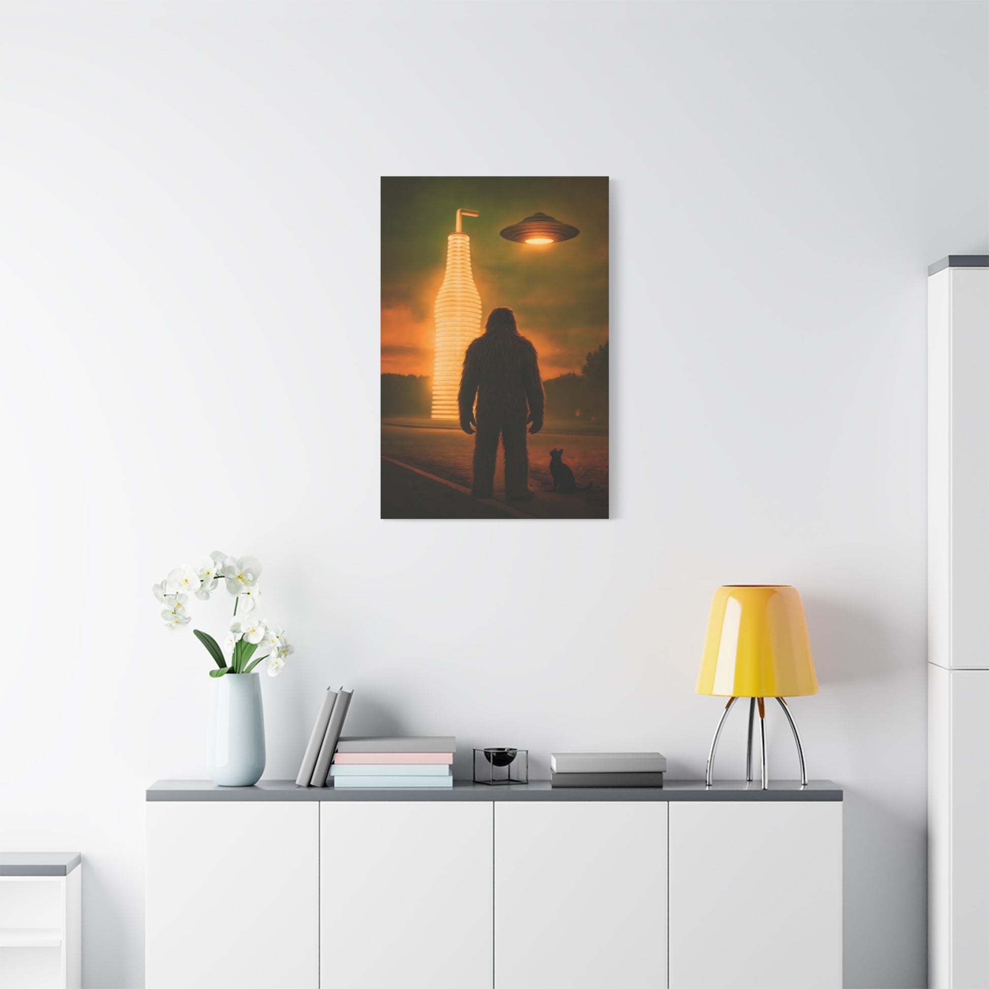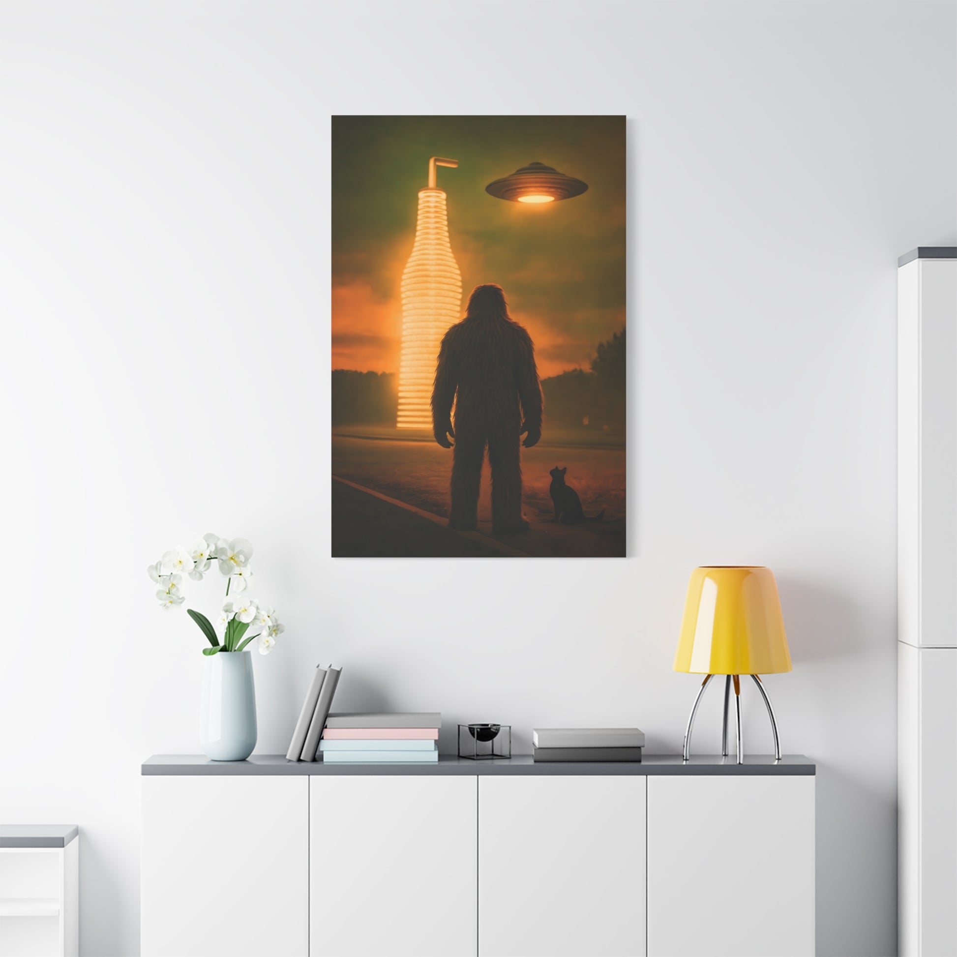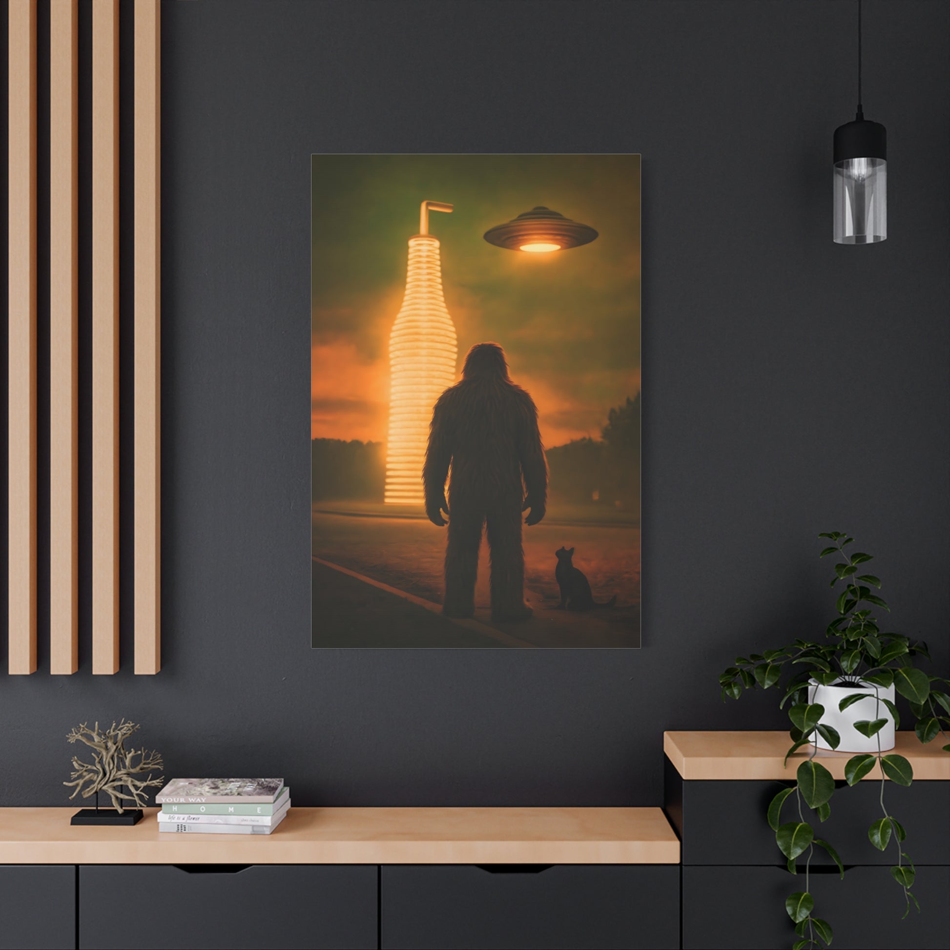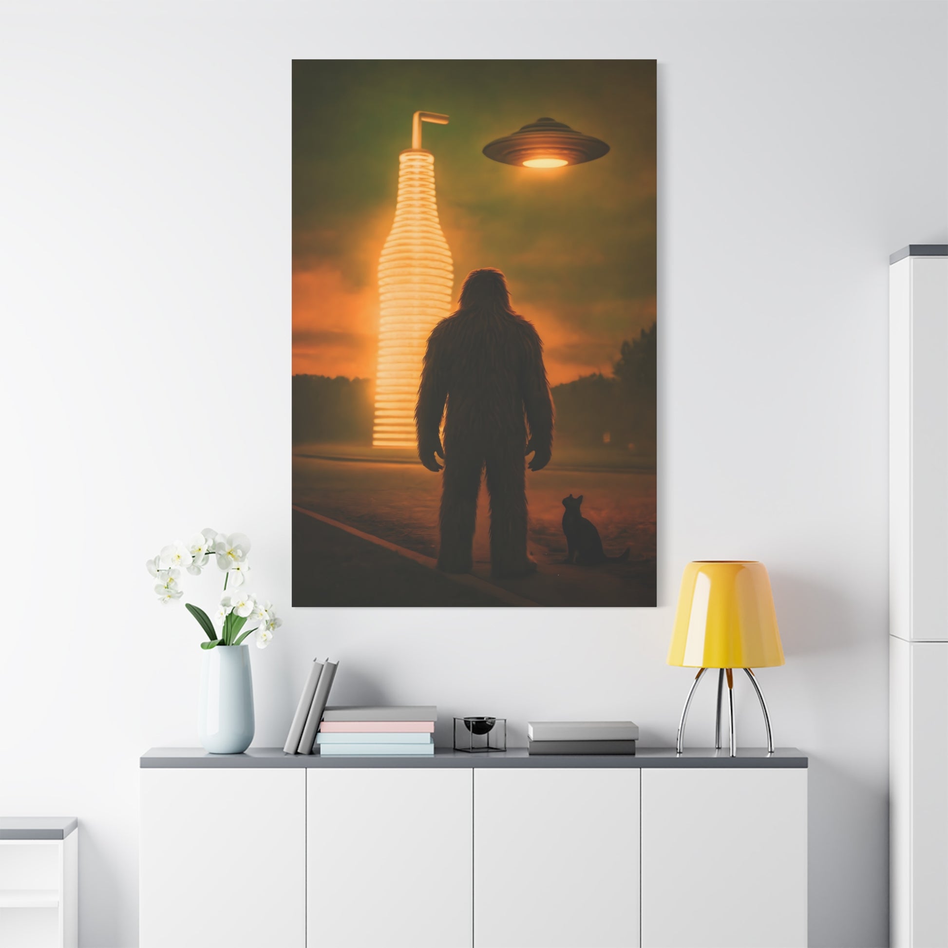 Thorne the Sasquatch and Sebastian the cosmic black cat share a surreal moment under Oklahoma’s neon skies on historic Route 66. Standing before the glowing soda bottle landmark, they witness a hovering UFO that turns the roadside into a stage for the extraordinary. This piece blends Americana nostalgia with paranormal mystery—perfect for fans of cryptids, cosmic folklore, and dreamlike road trip aesthetics.