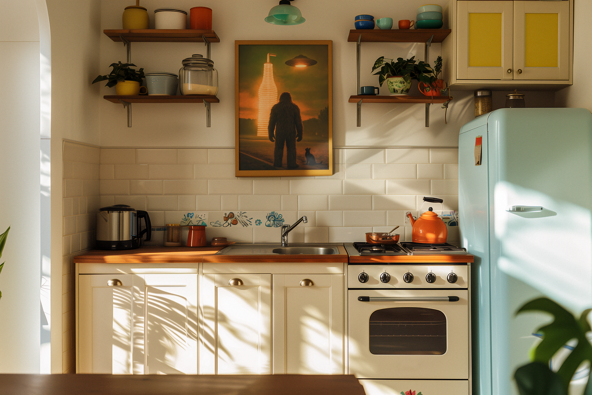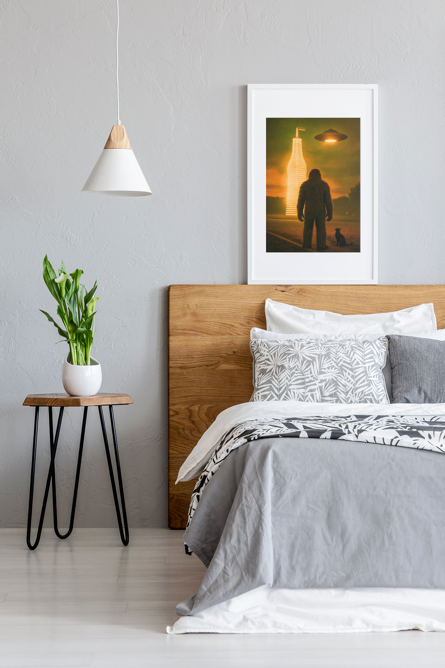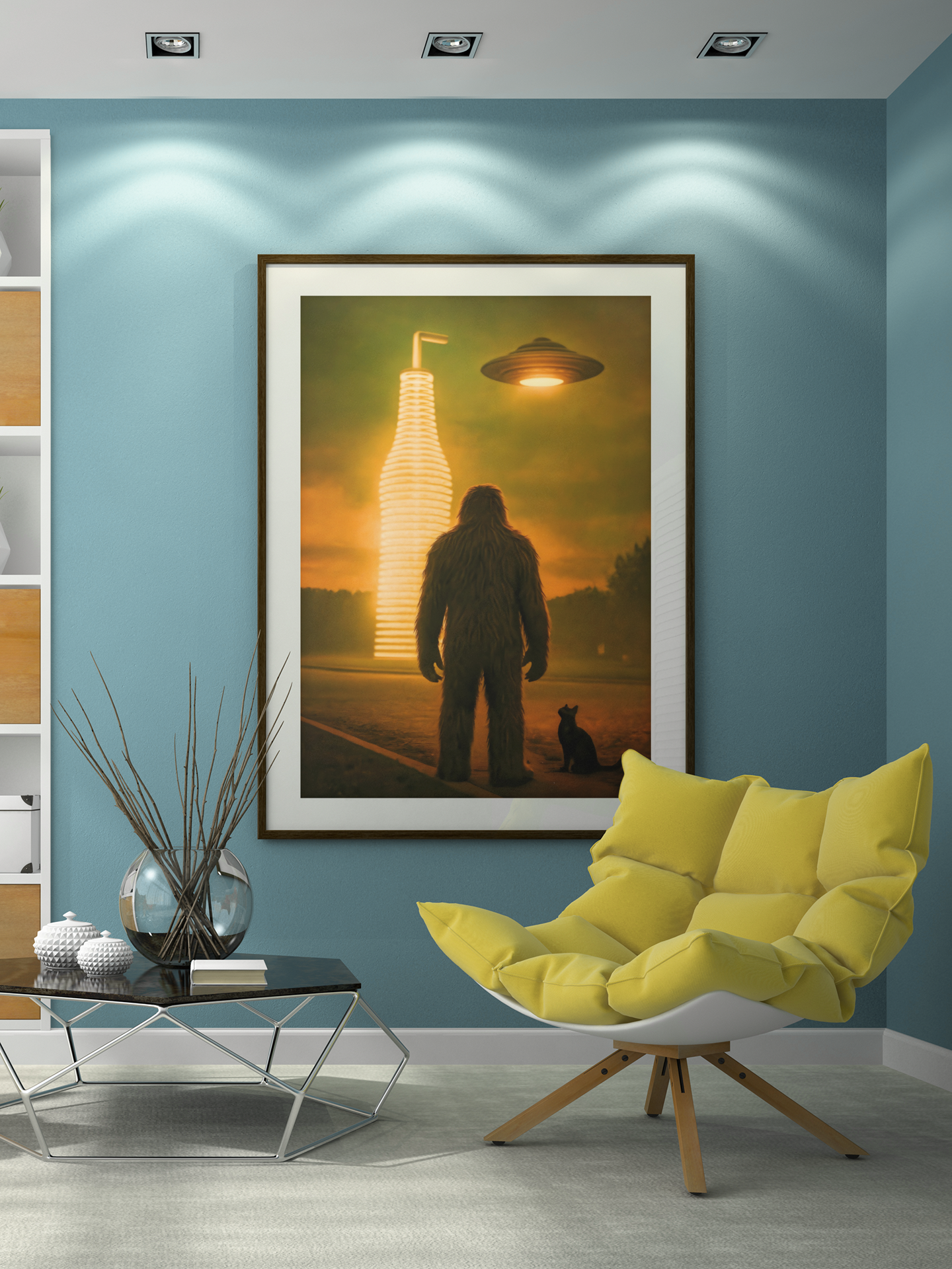 Bring home a slice of Paranormal Americana with this print, where everyday roadside attractions transform into portals of wonder and curiosity. Whether you’re drawn to Route 66 culture, eerie legends, or whimsical stargazing, this artwork makes a bold statement in any collection.