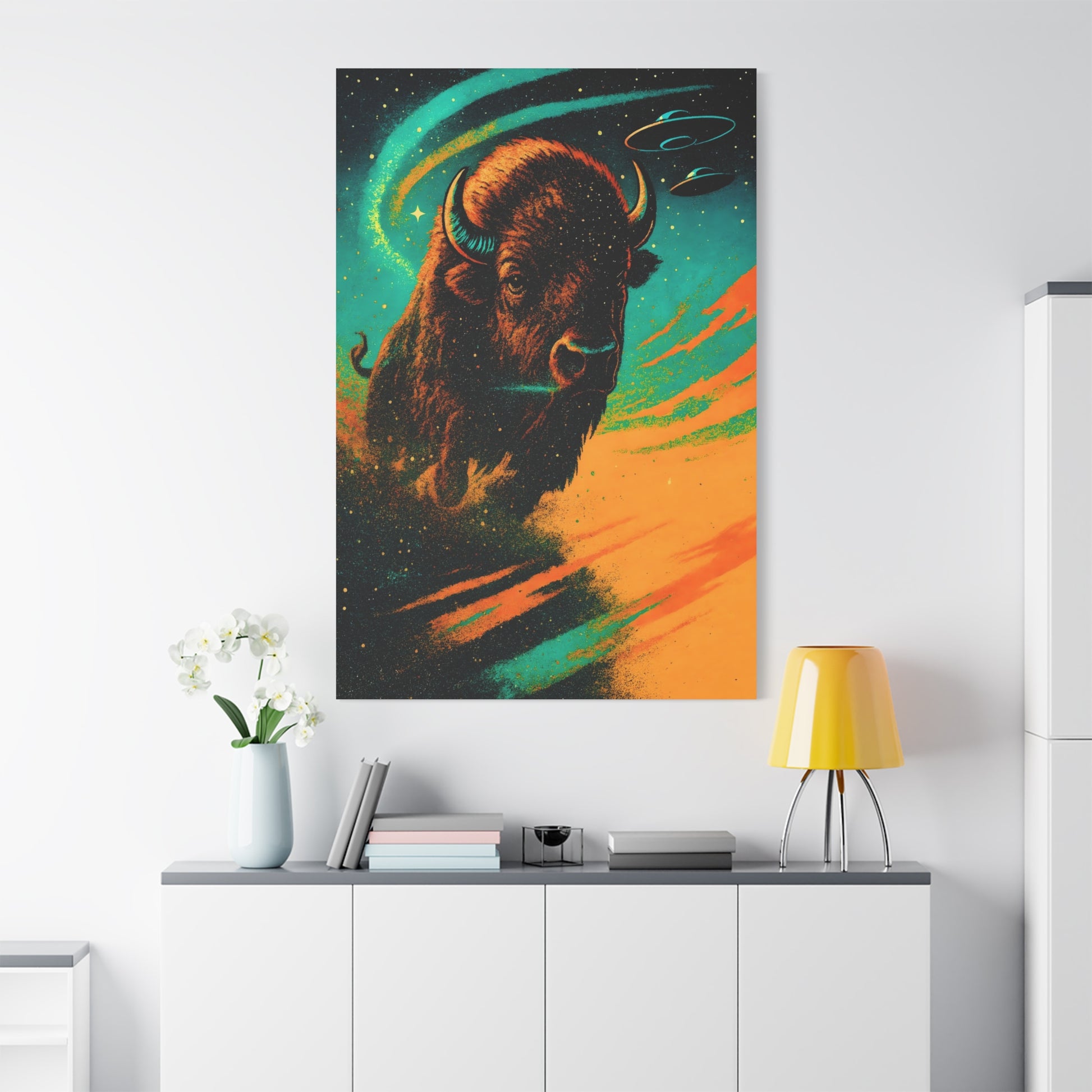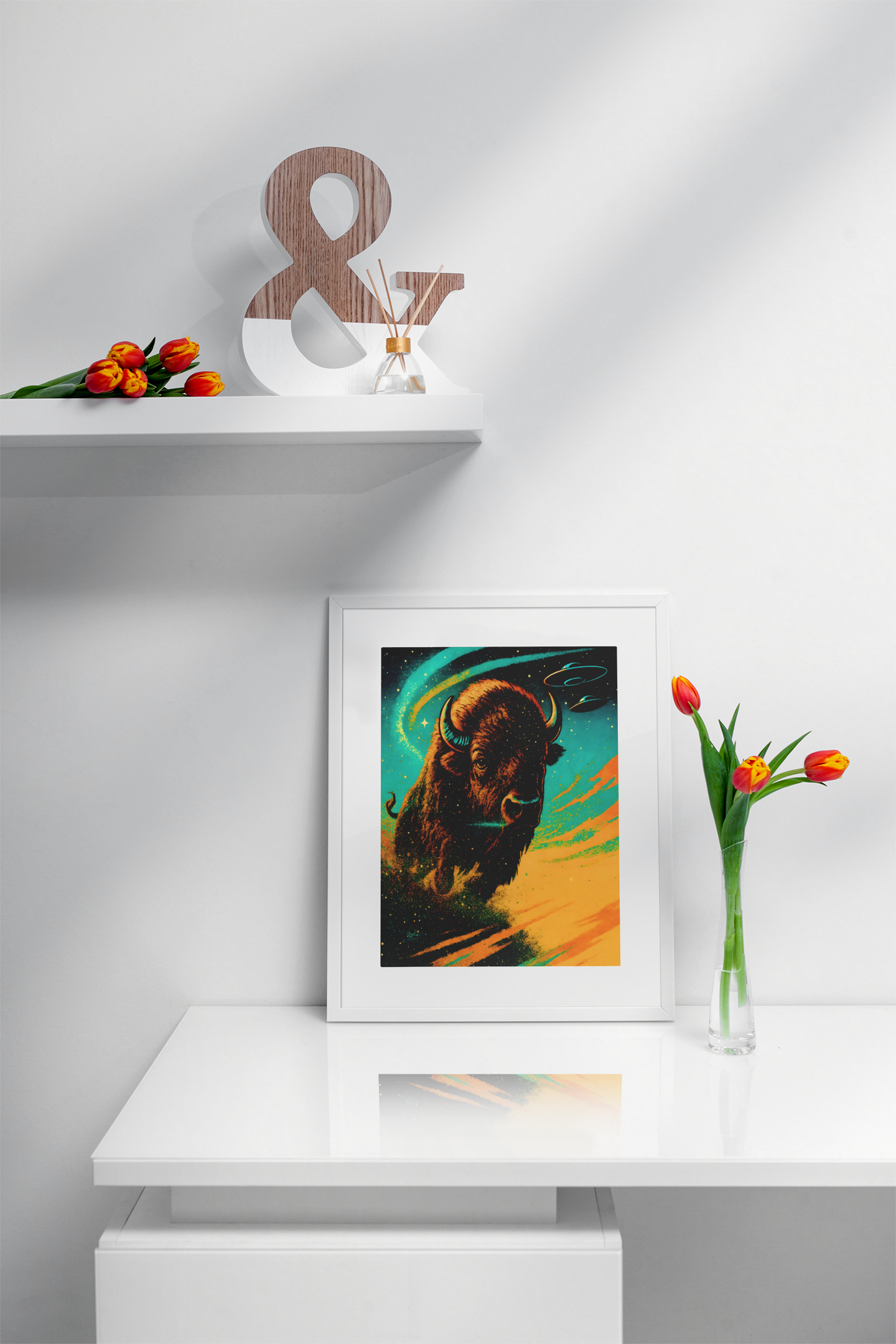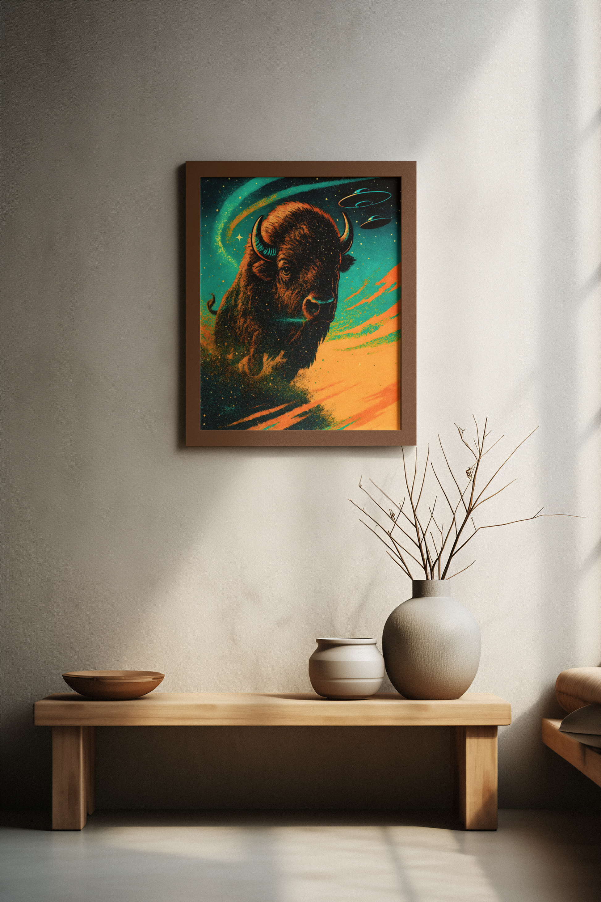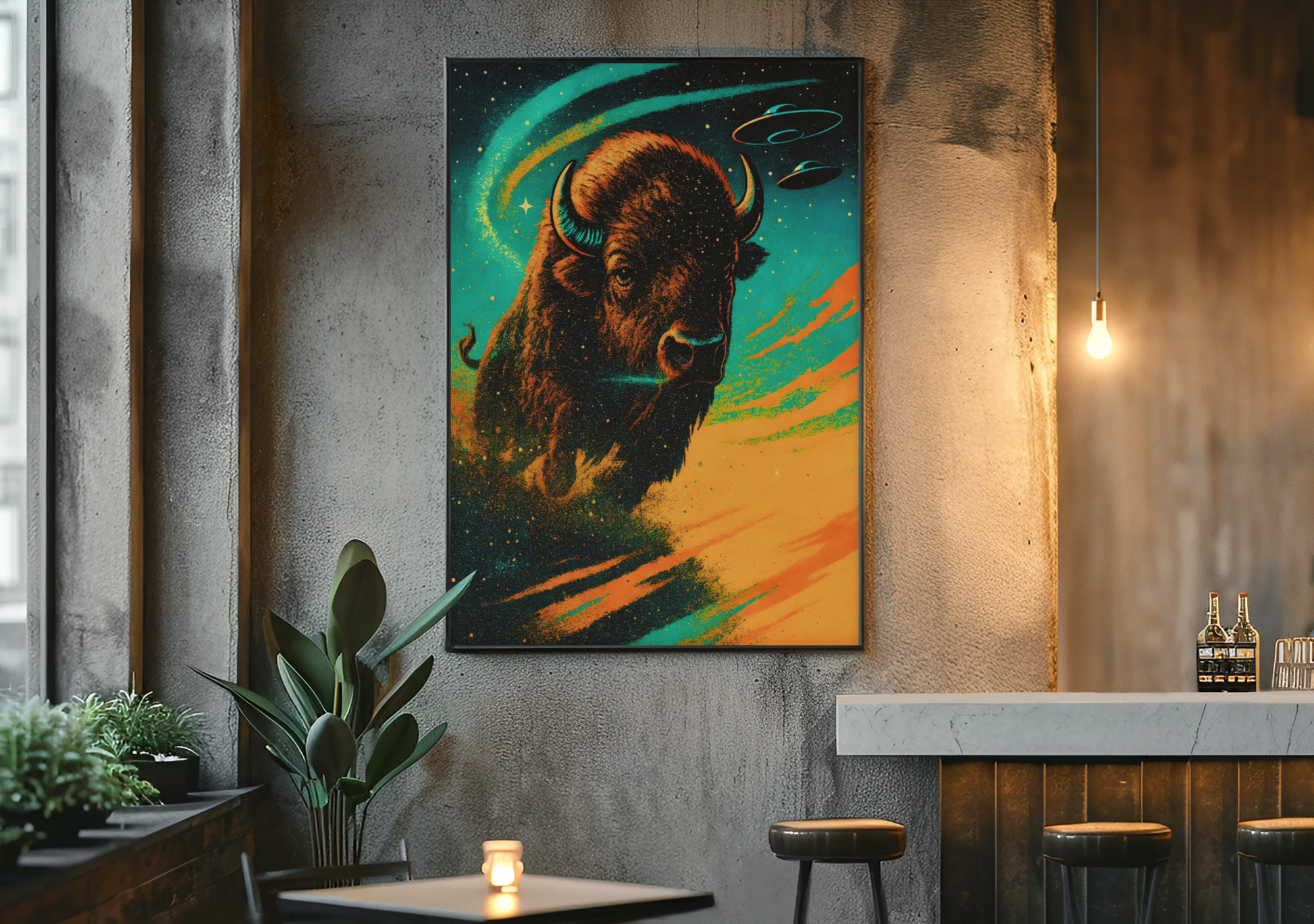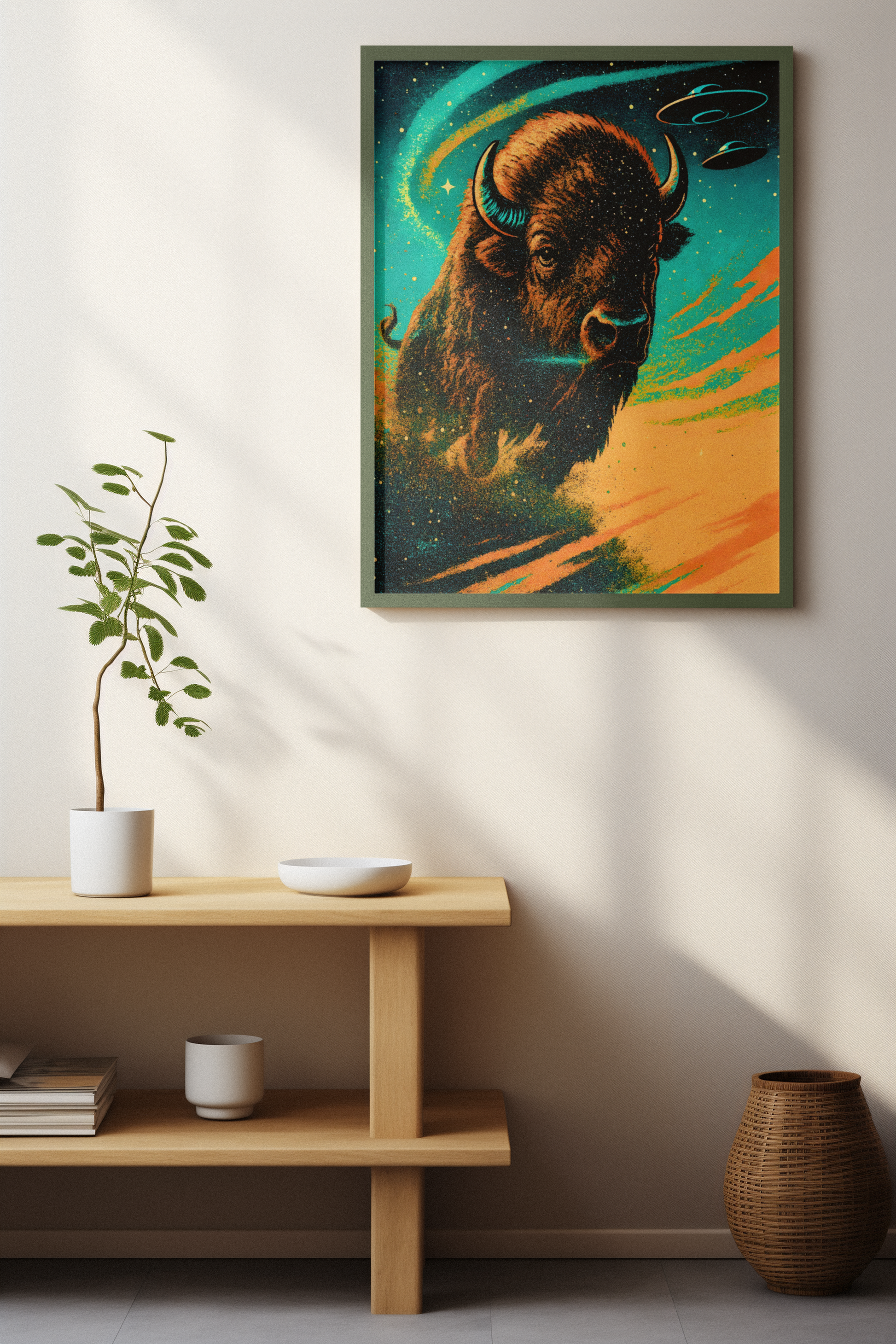 A lone buffalo charges forward across the prairie, its silhouette illuminated by a sky alive with galaxies and strange lights. UFOs drift silently overhead, watching as the herd’s spirit thunders through space and time. This piece blends gothic western grit with cosmic wonder, embodying the essence of the Starlit Stampede collection.