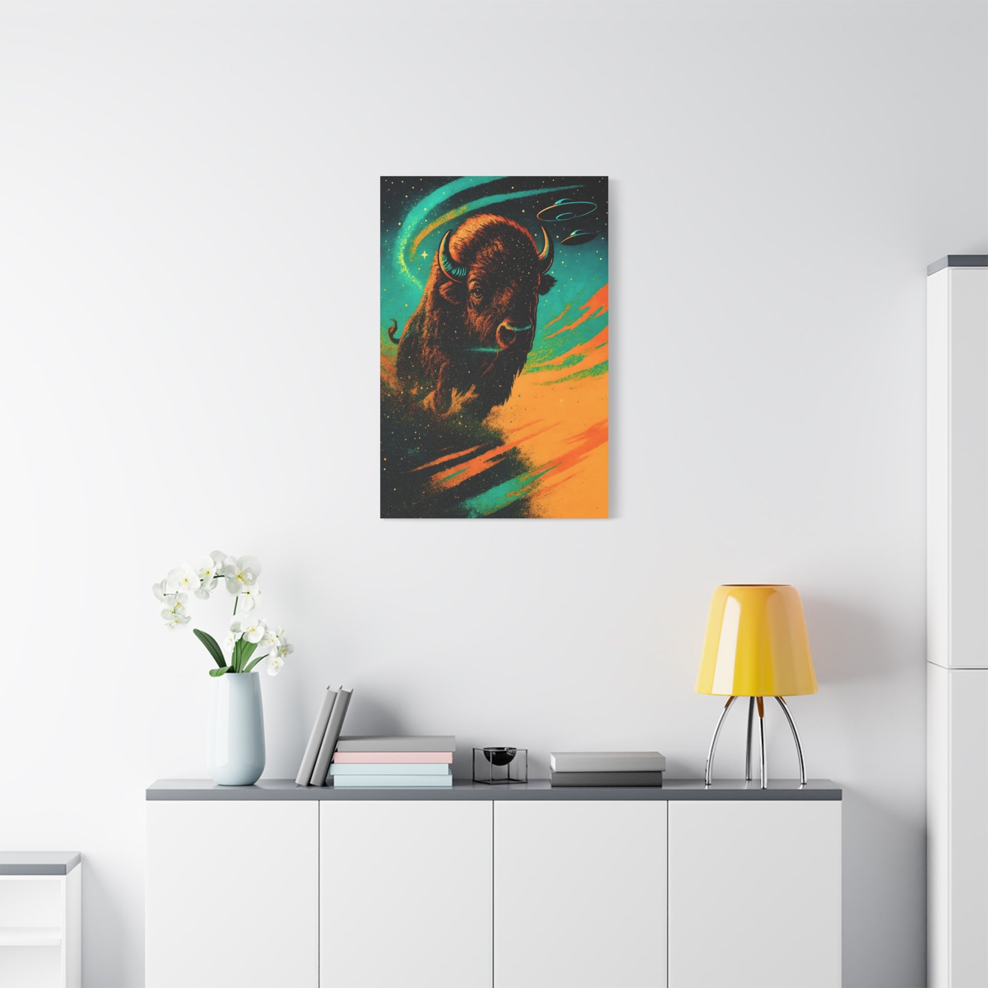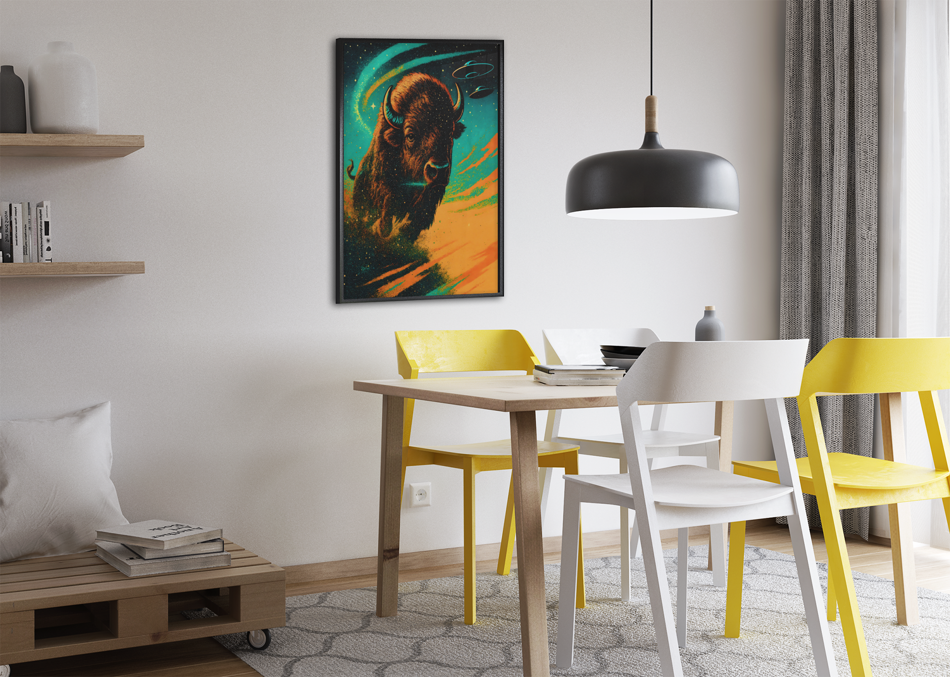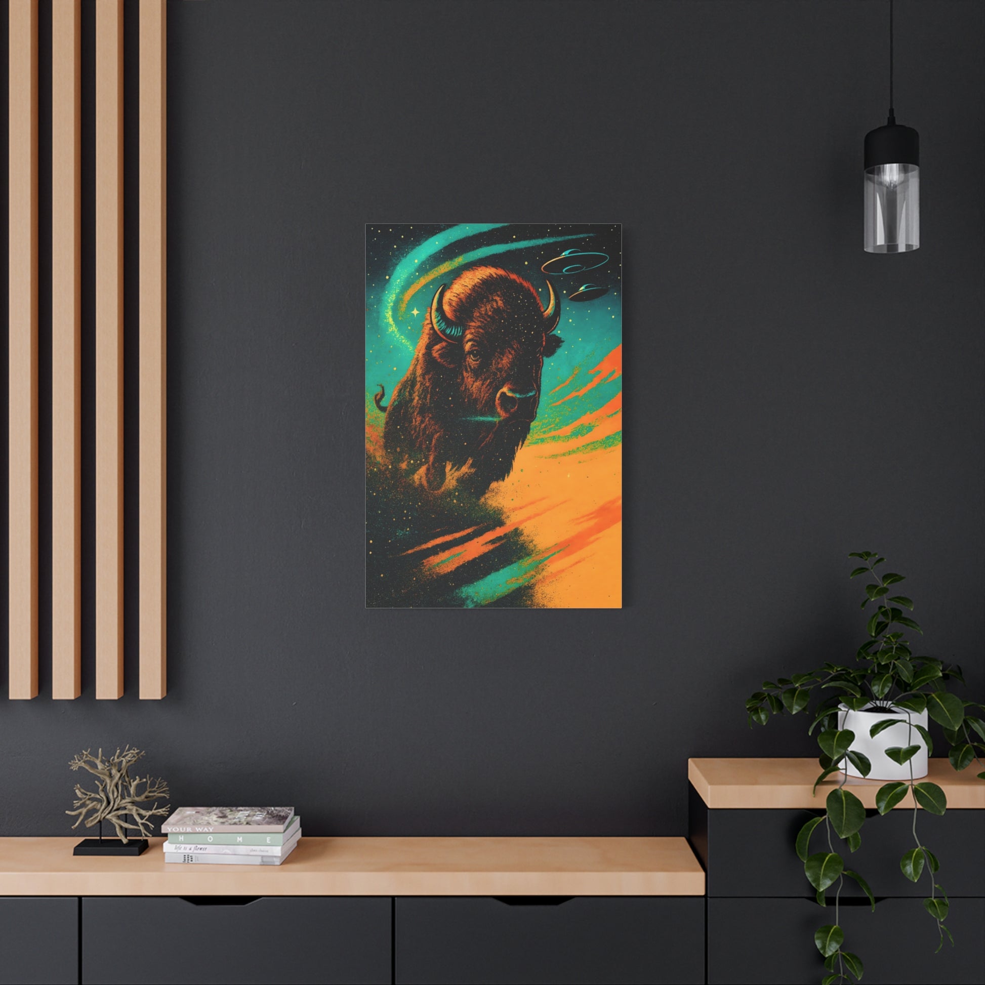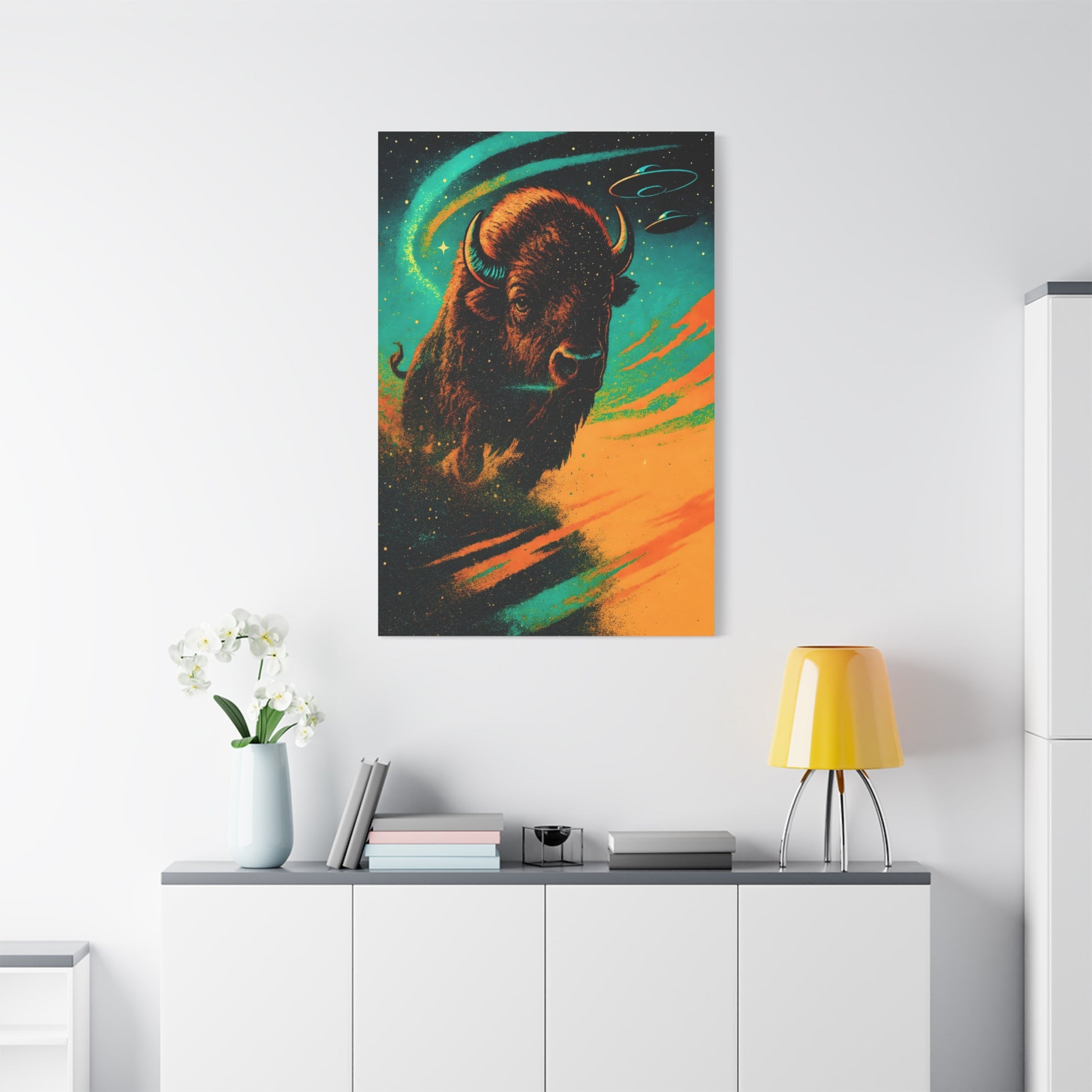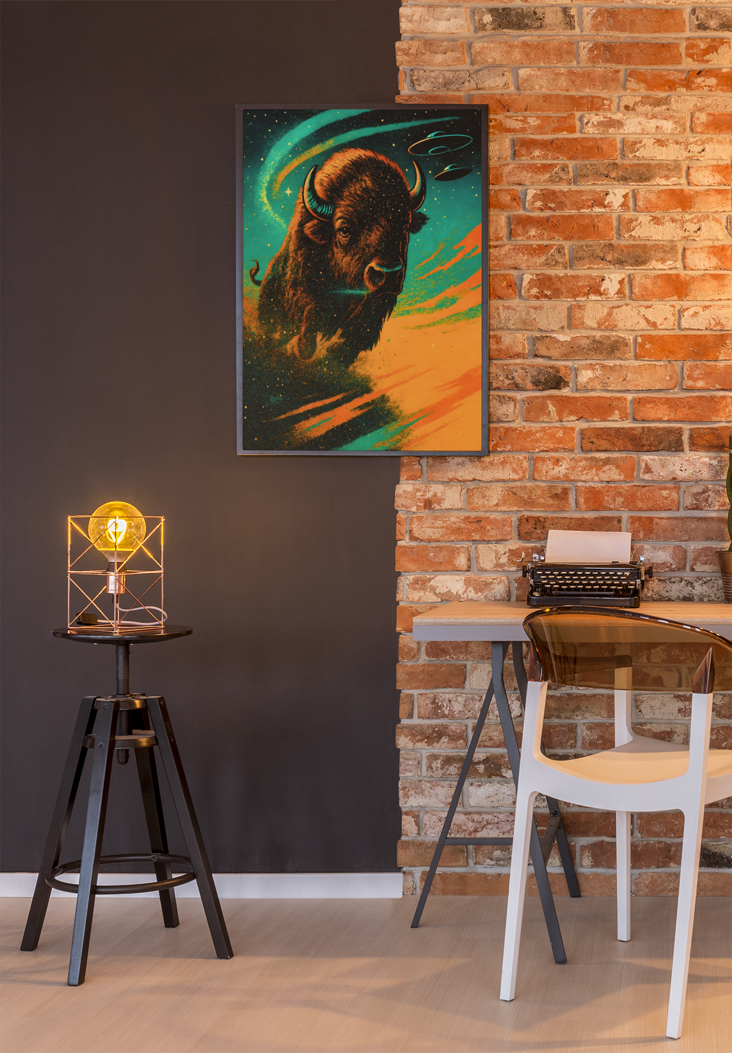 A lone buffalo charges forward across the prairie, its silhouette illuminated by a sky alive with galaxies and strange lights. UFOs drift silently overhead, watching as the herd’s spirit thunders through space and time. This piece blends gothic western grit with cosmic wonder, embodying the essence of the Starlit Stampede collection.