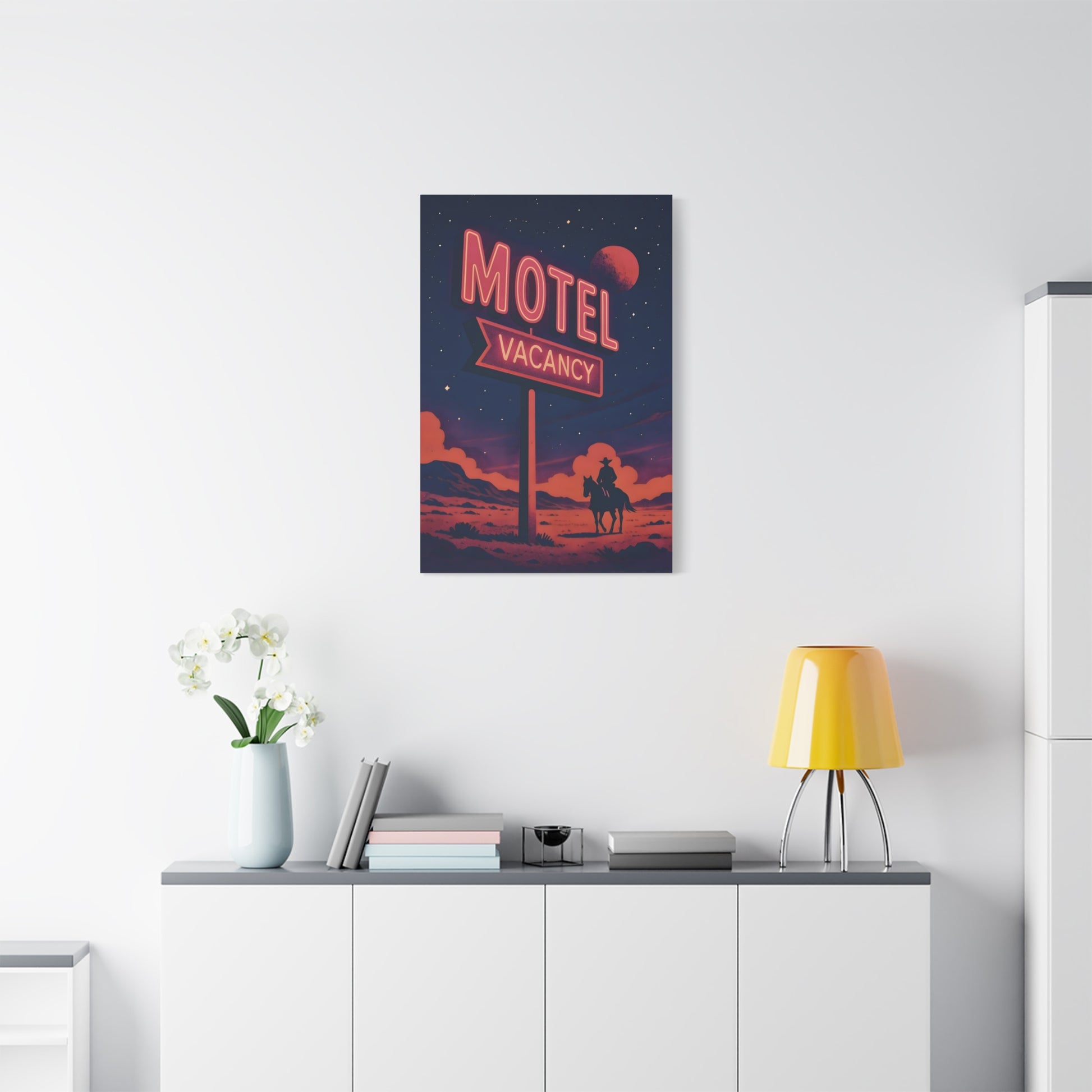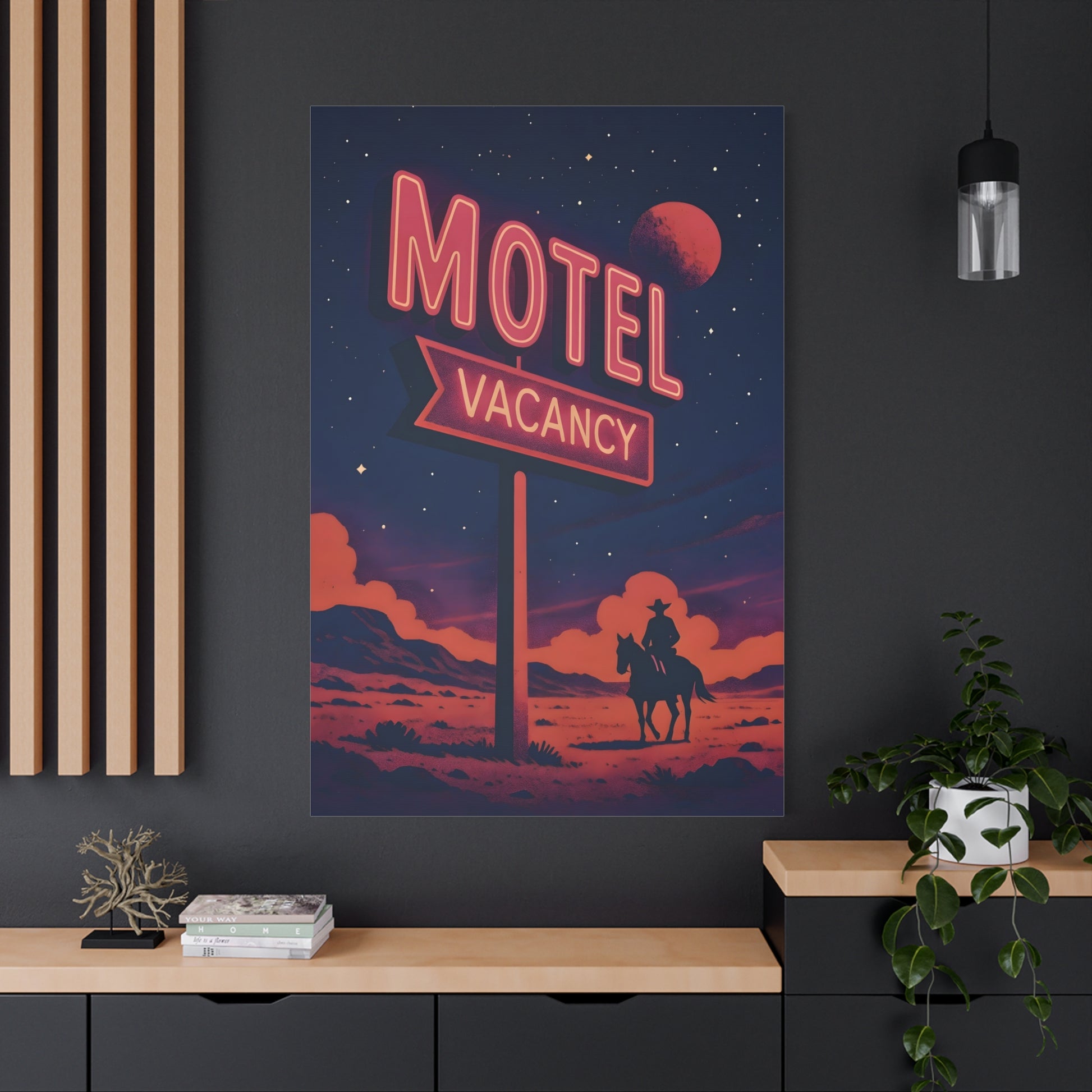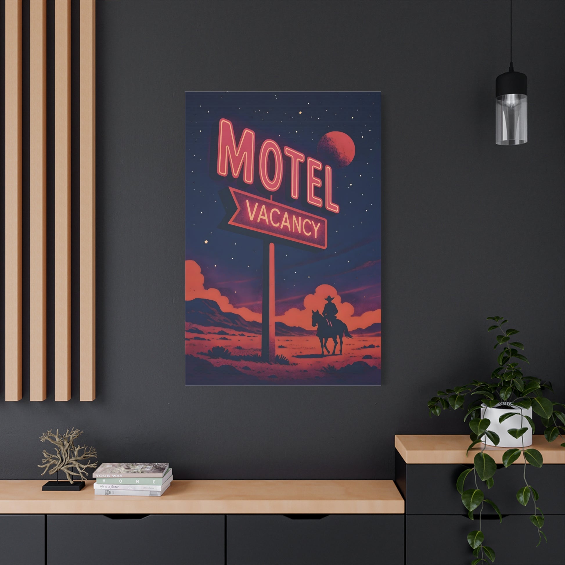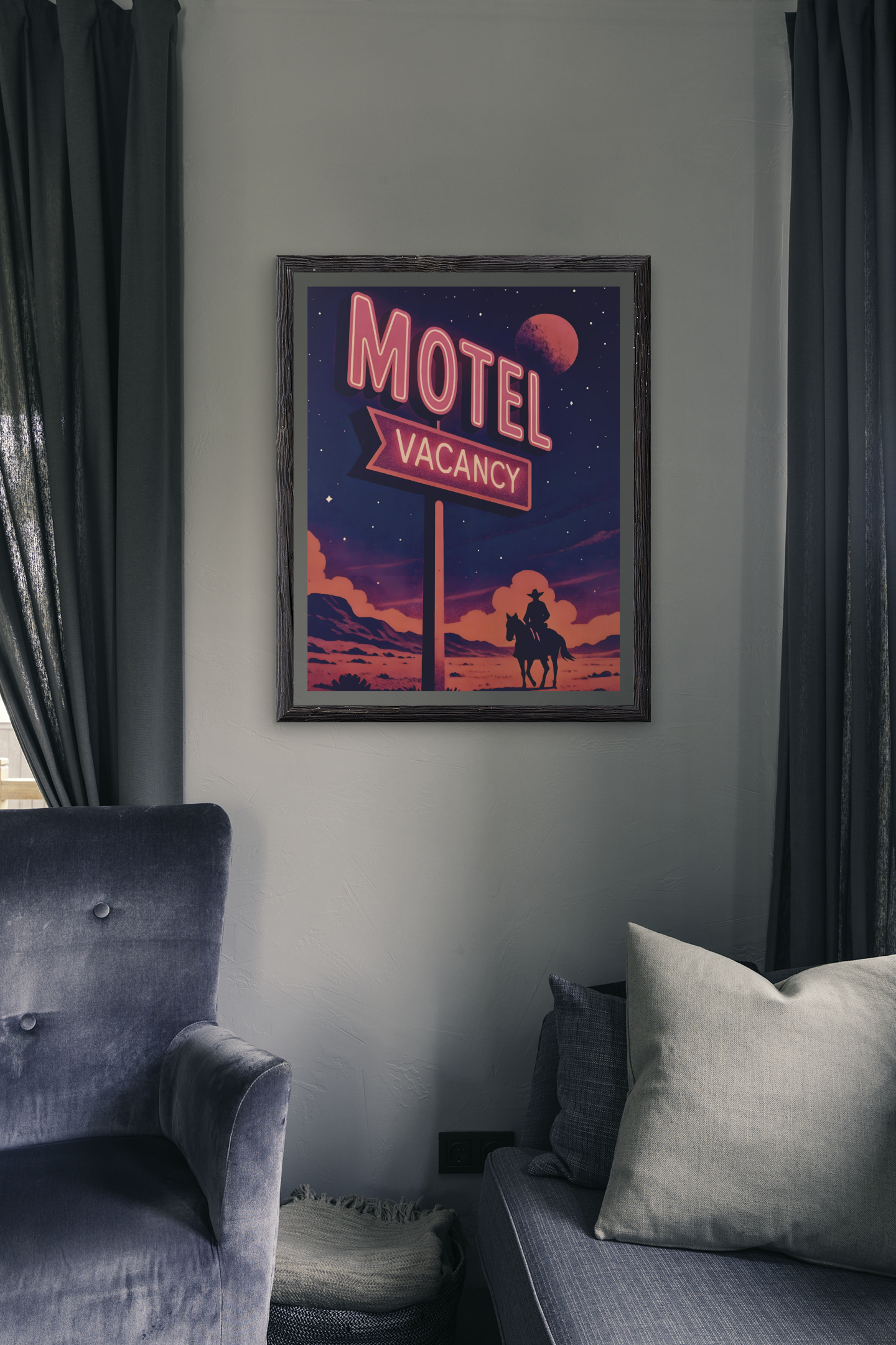 A lone cowboy pauses beneath a glowing neon motel sign, where the desert night hums with silence and the promise of mystery. The surreal landscape, bathed in cosmic pinks and deep indigos, blurs the line between earthly wanderlust and celestial wonder.